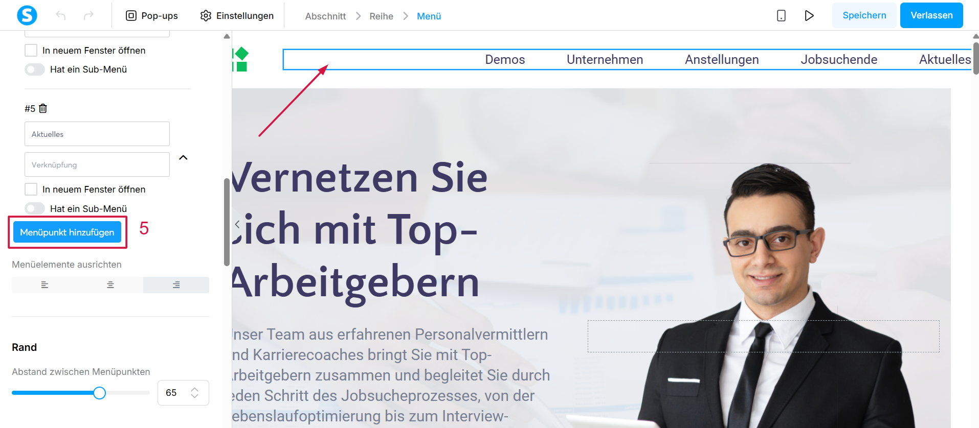 Gehen Sie zurück zum Editor Ihrer Startseite, klicken Sie auf das Menü-Element, um dessen Einstellungen zu öffnen, und klicken Sie anschließend auf „Menüpunkt hinzufügen“ (5).