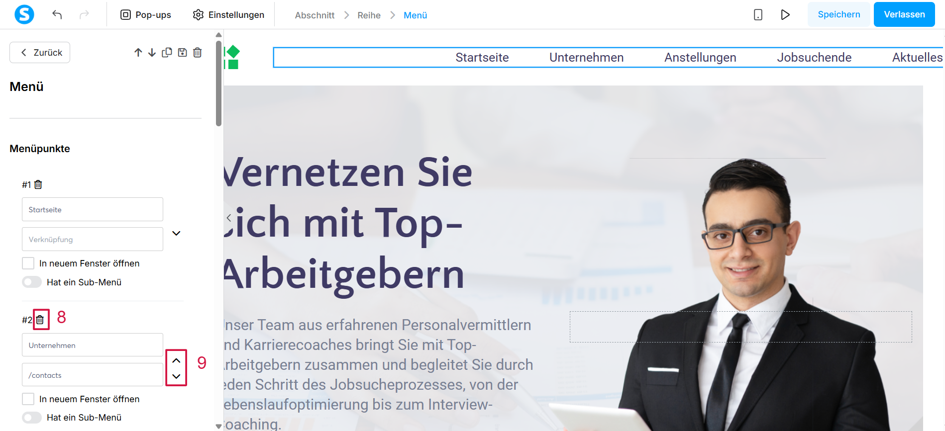 Sie können Menüeinträge löschen, indem Sie auf das Papierkorb-Symbol (8) klicken, und ihre Reihenfolge ändern, indem Sie auf die Pfeile (9) klicken.