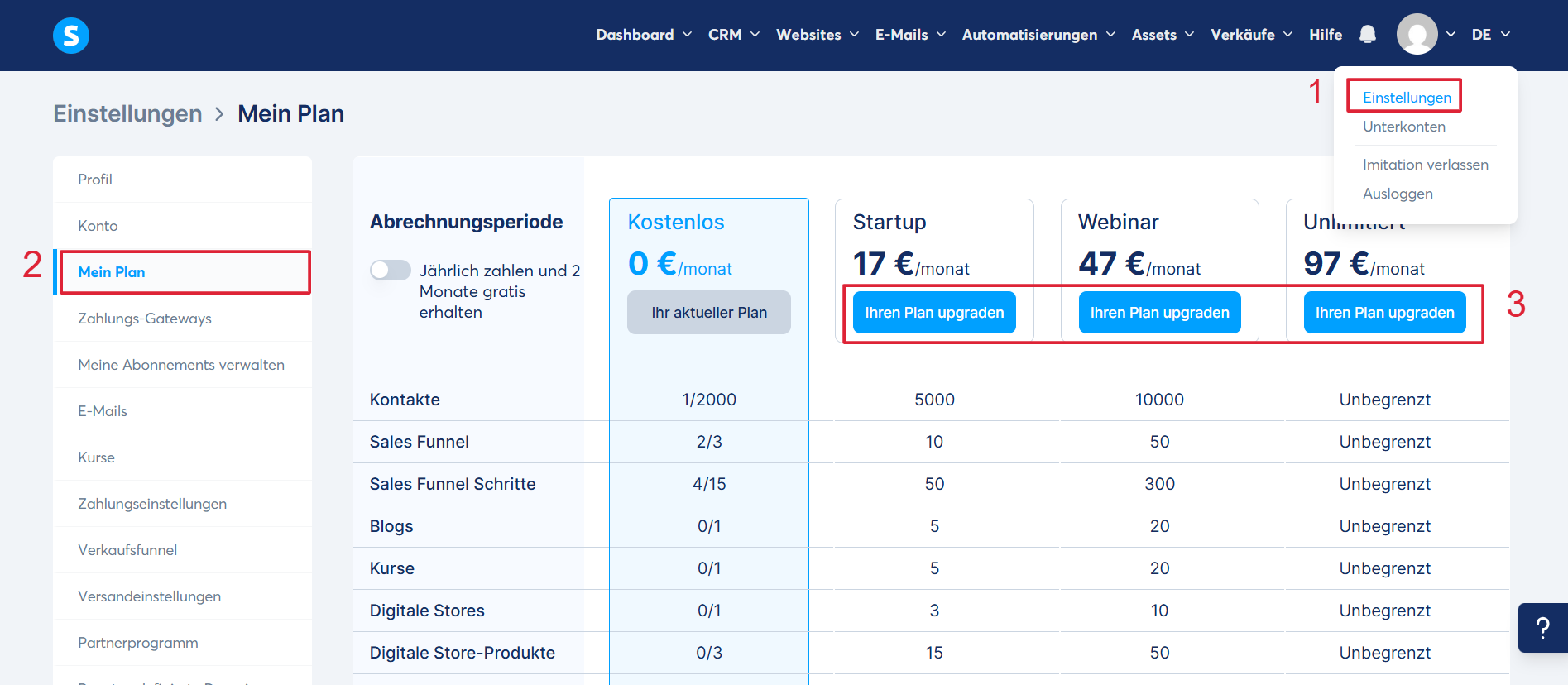 Sie können Ihr systeme.io Abonnement direkt in Ihrem Konto erwerben oder upgraden, indem Sie auf Einstellungen (1) klicken.