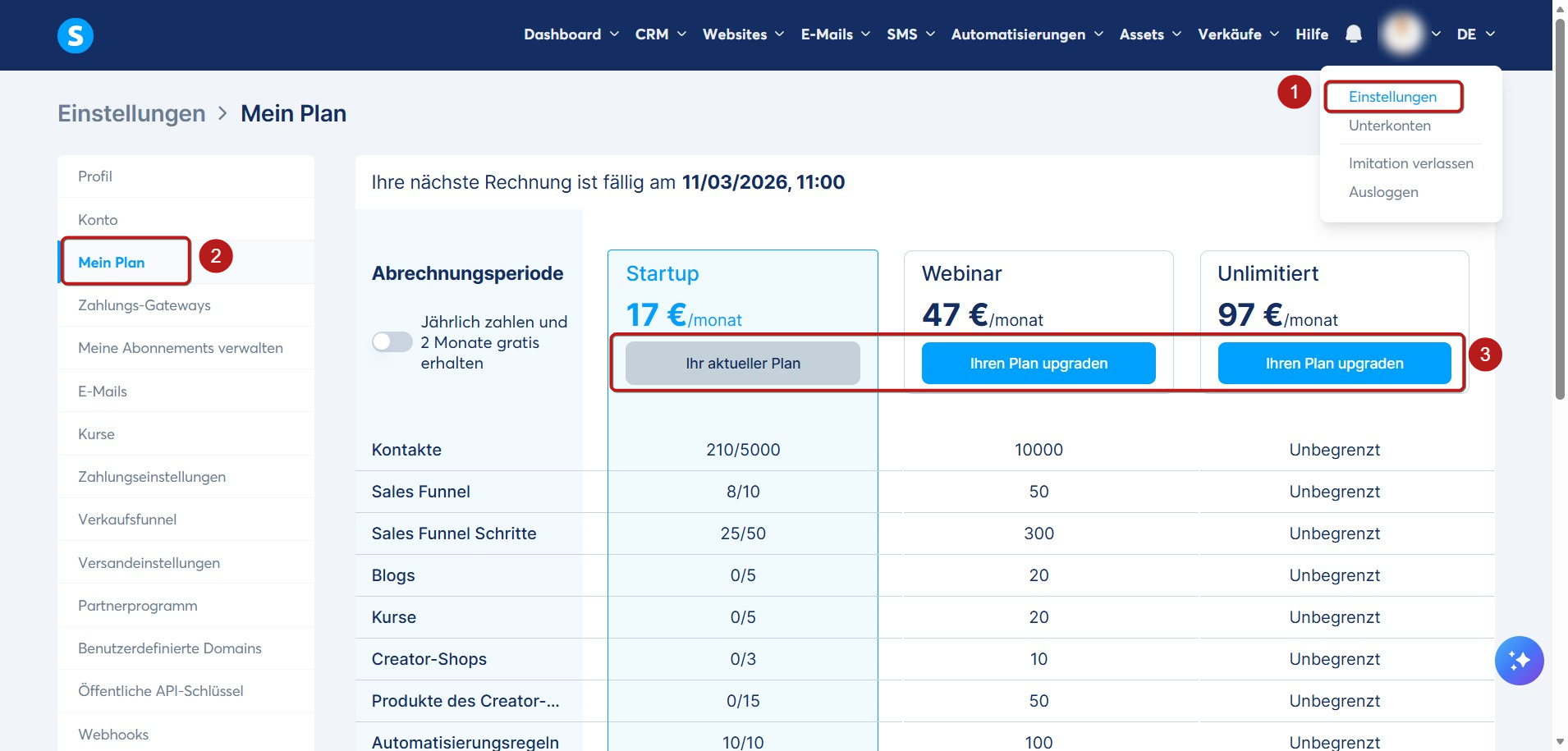 Sie können Ihr systeme.io-Abonnement direkt in Ihrem Konto kaufen oder upgraden, indem Sie auf Einstellungen (1) klicken.