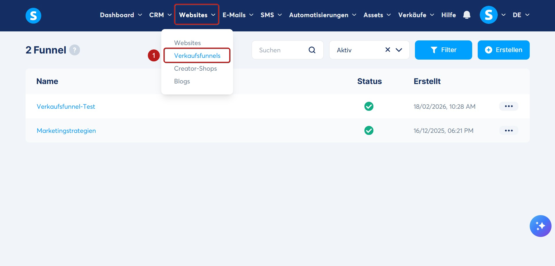 Gehen Sie im Menü zum Tab Websites und klicken Sie auf Verkaufsfunnels (1), um Ihre Funnel-Liste anzuzeigen.