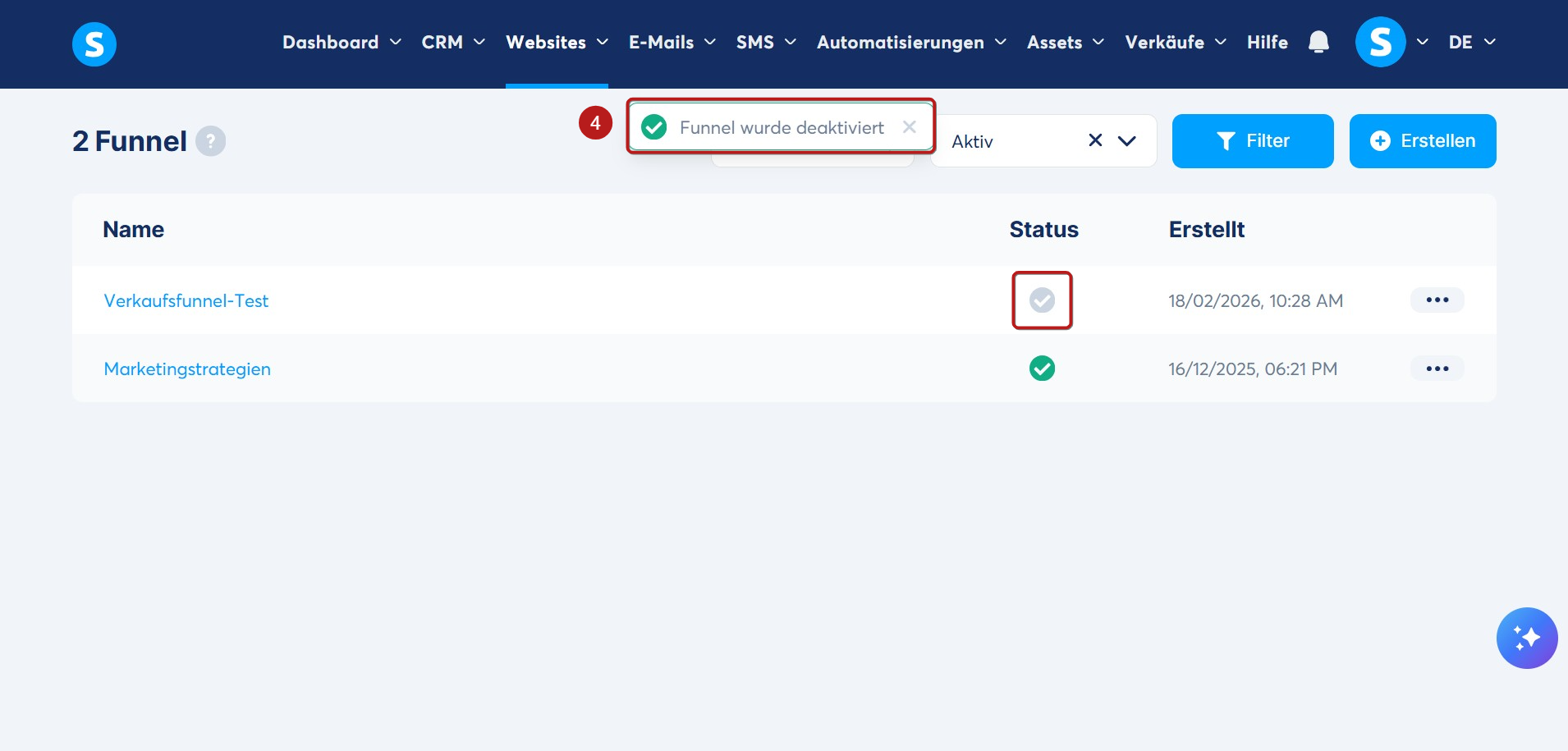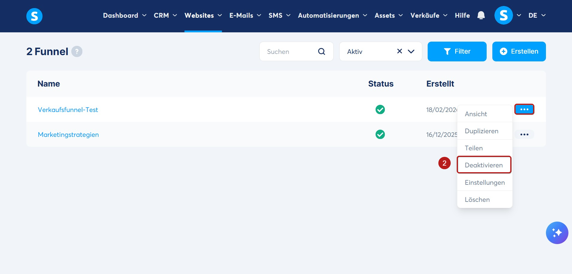 Suchen Sie den Funnel, den Sie deaktivieren möchten, klicken Sie auf die drei Punkte (…) und wählen Sie Deaktivieren (2) aus.