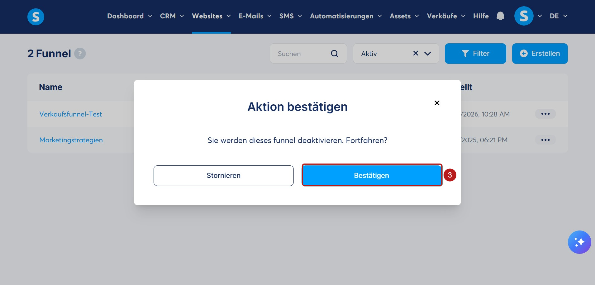 Klicken Sie im angezeigten Popup-Fenster auf Bestätigen (3), um den Funnel zu deaktivieren.
