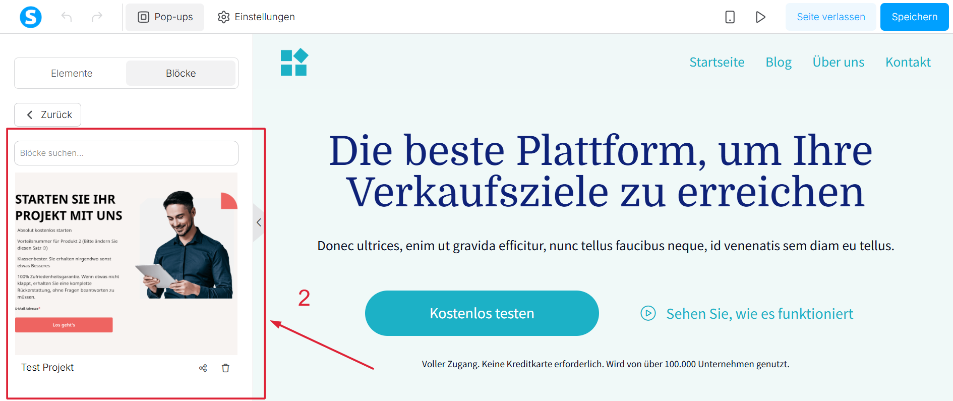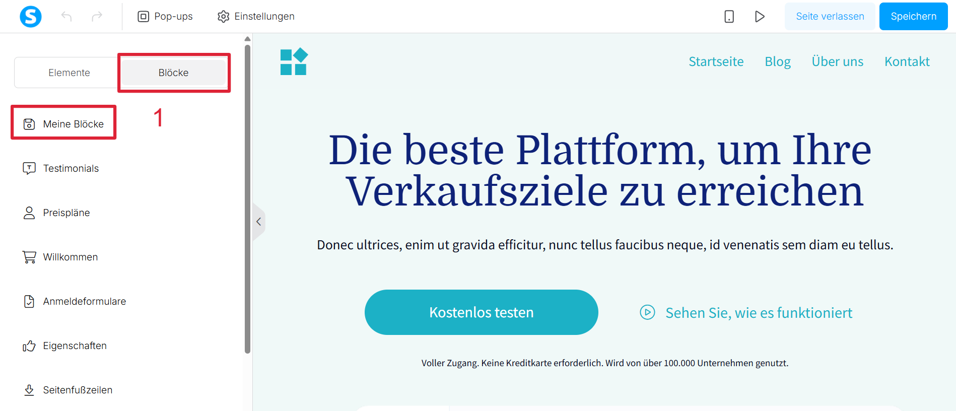 Um einen Block teilen zu können, öffnen Sie den Editor einer Ihrer Seiten und klicken Sie dann auf „Blöcke“ (1).