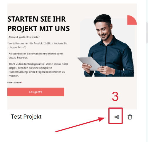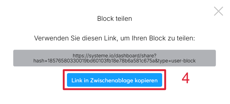 Nachdem Sie auf das Freigabesymbol geklickt haben, erscheint ein Popup-Fenster mit einer URL und einem Button, der die URL des geteilten Blocks enthält. Damit können Sie den Block mit anderen Nutzern von systeme.io teilen (4).