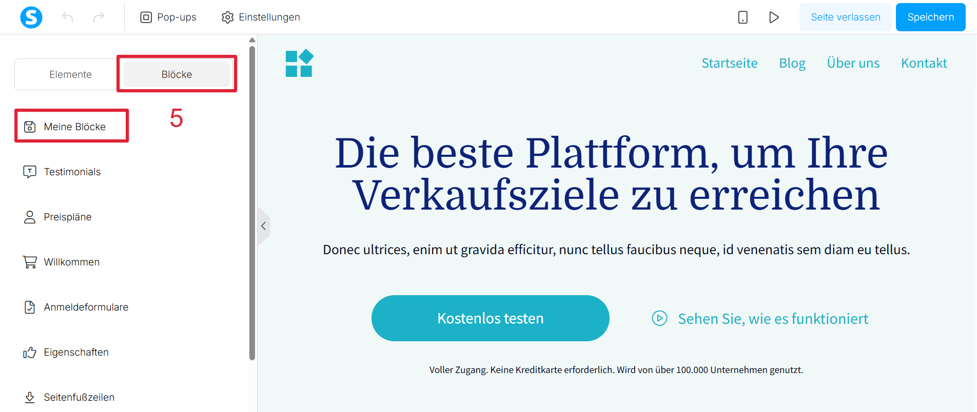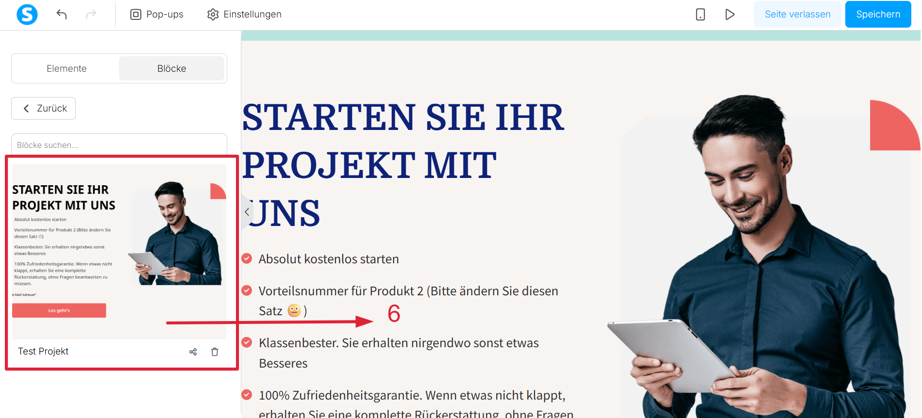 Sie müssen den entsprechenden Block auswählen und an die gewünschte Stelle auf Ihrer Seite ziehen (6).