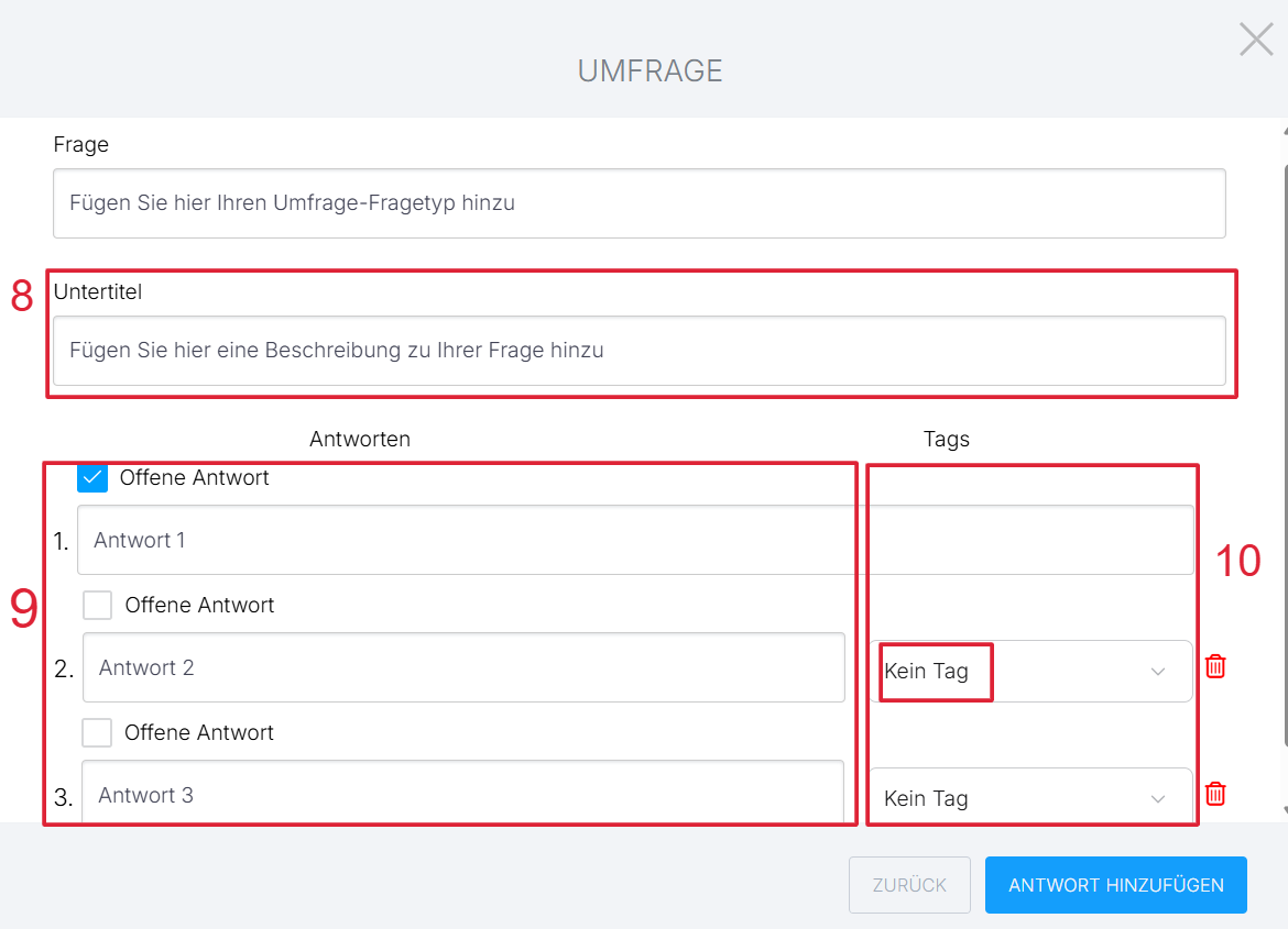 - Jede Antwort mit einem bestimmten Tag versehen, um die Kontakte, die diese Antwort ausgewählt haben, leicht zu unterscheiden und zu erkennen. Wenn Sie beim Auswählen dieser Antwort keinen Tag hinzufügen möchten, können Sie dieses Feld leer lassen (10).