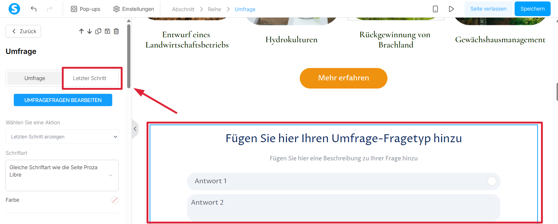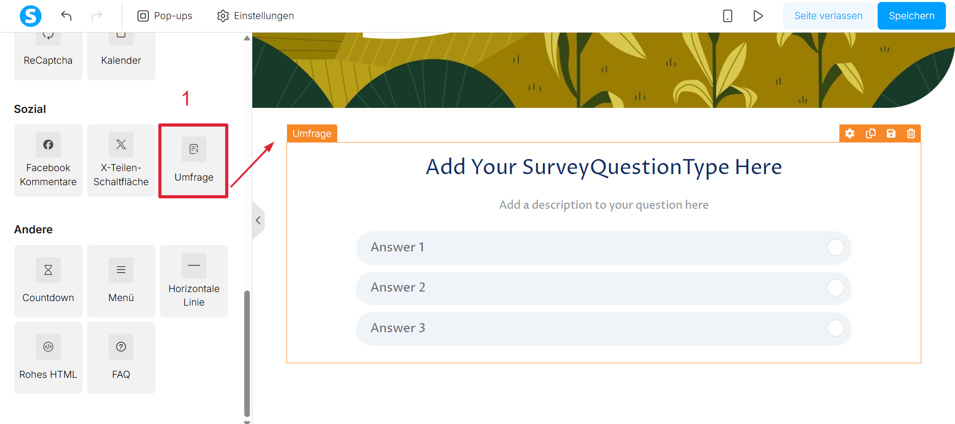 Ziehen Sie im Seiteneditor das Umfrage-Element aus dem linken Bereich und legen Sie es auf Ihrer Seite ab (1).