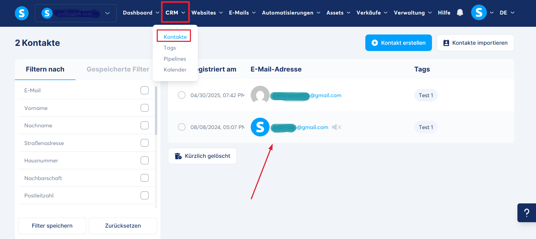 Um auf das Kontaktprofil zuzugreifen, gehen Sie zu „CRM“, dann zu „Kontakte“ und klicken Sie auf die E-Mail-Adresse des Kontakts.