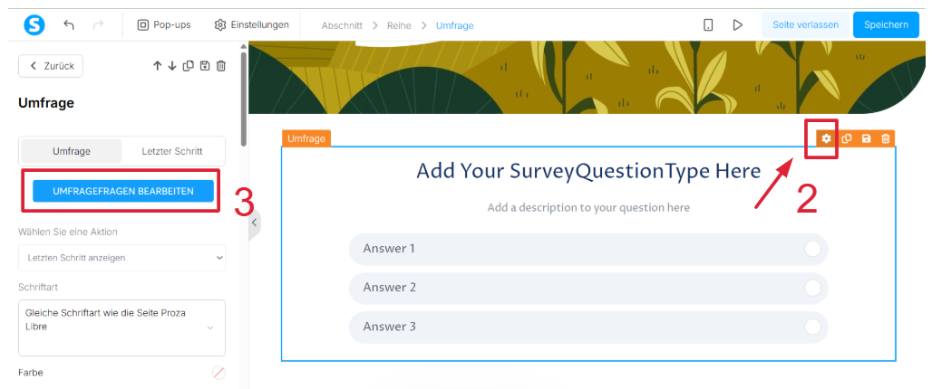 Um das Umfrage-Element zu bearbeiten, klicken Sie auf das Konfigurationssymbol (2) und dann auf „Umfragefragen bearbeiten“ (3).