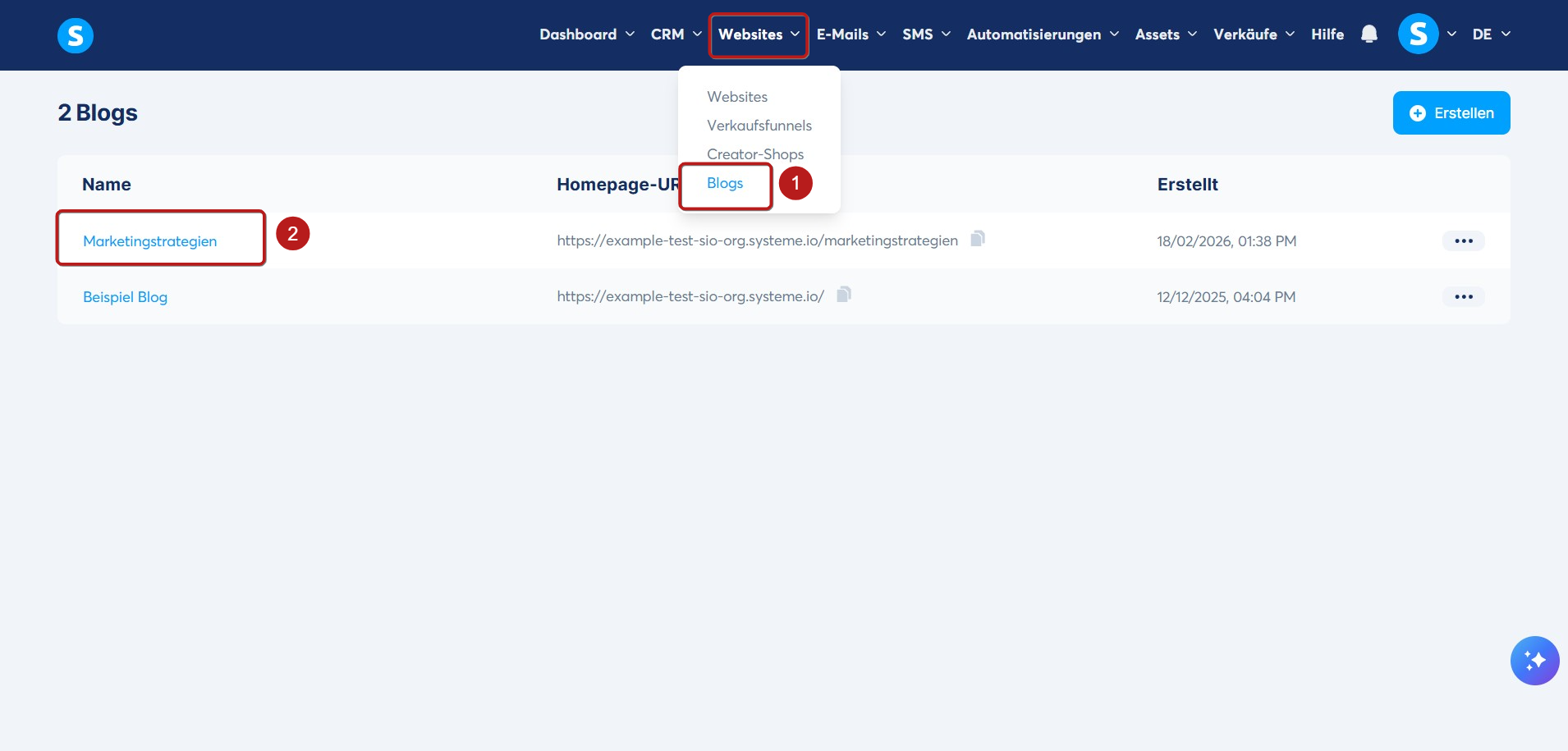 Gehen Sie zum Tab Websites und wählen Sie Blogs (1) aus. Klicken Sie anschließend auf den Titel Ihres Blogs (2).