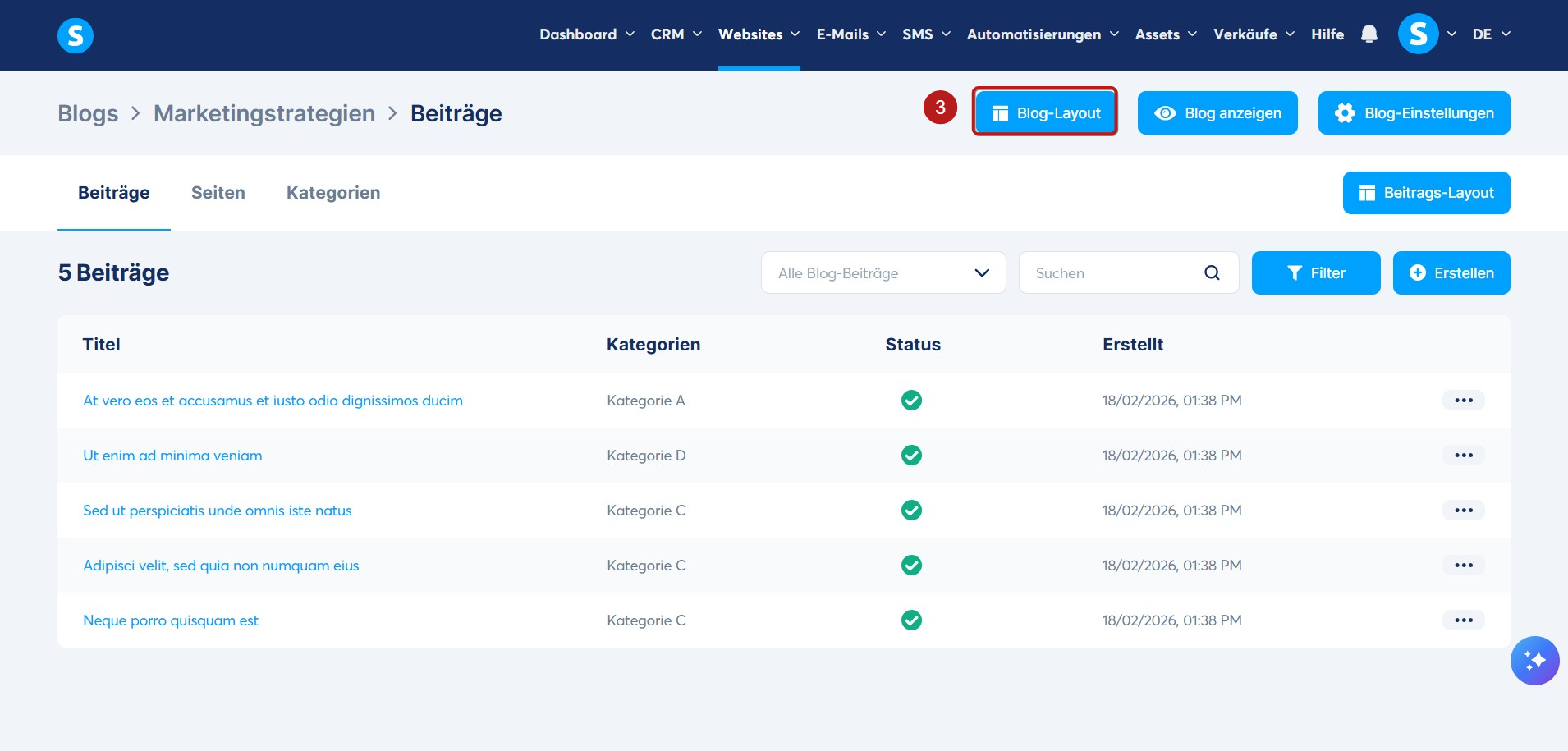 Sobald Sie sich im Menü Ihres Blogs befinden, klicken Sie auf die Schaltfläche Blog-Layout (3).