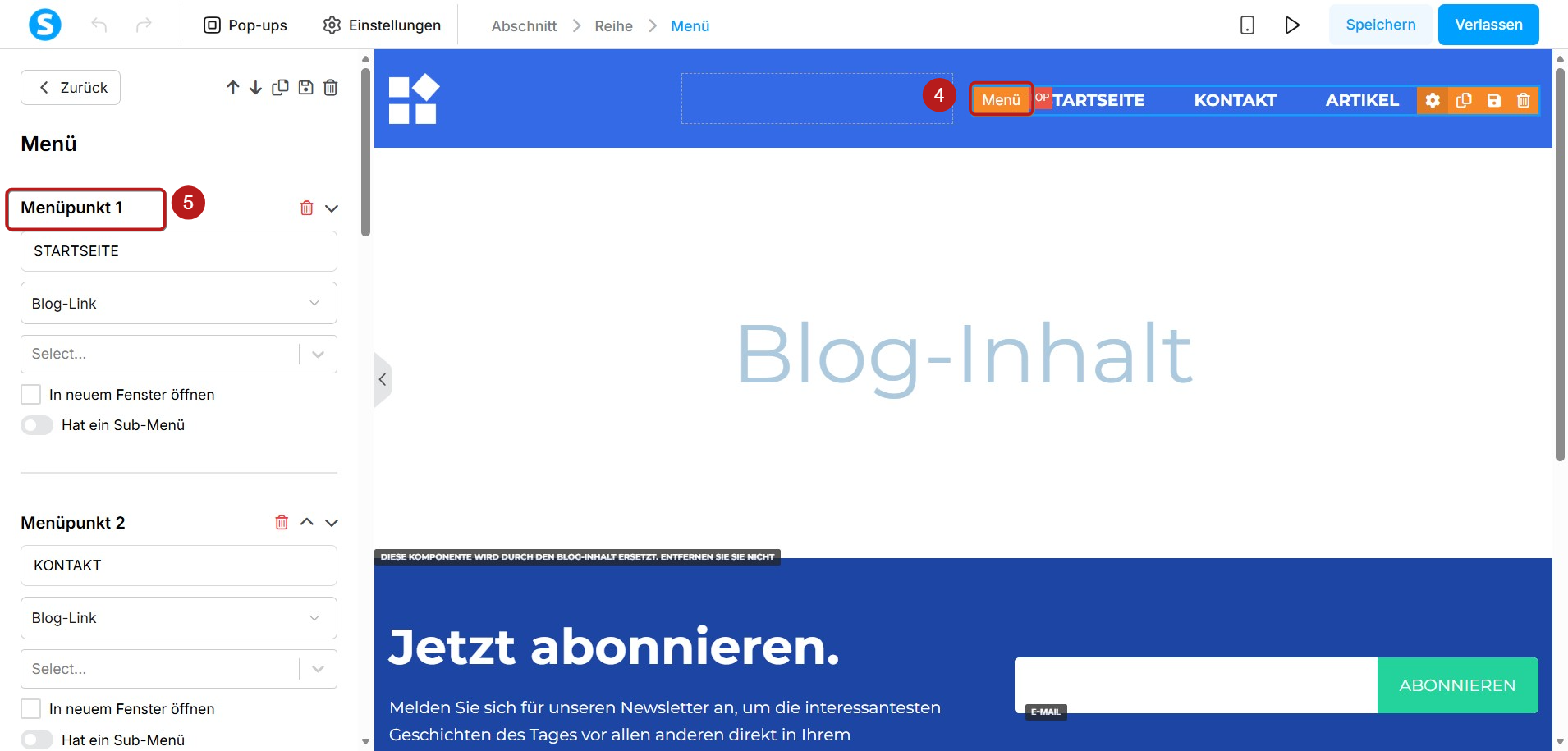 Die Seite des Blog-Layout-Editors wird geöffnet. Klicken Sie hier auf das Element Menu (4), um auf dessen Einstellungen zuzugreifen. Alle Menüpunkte (5) werden angezeigt.