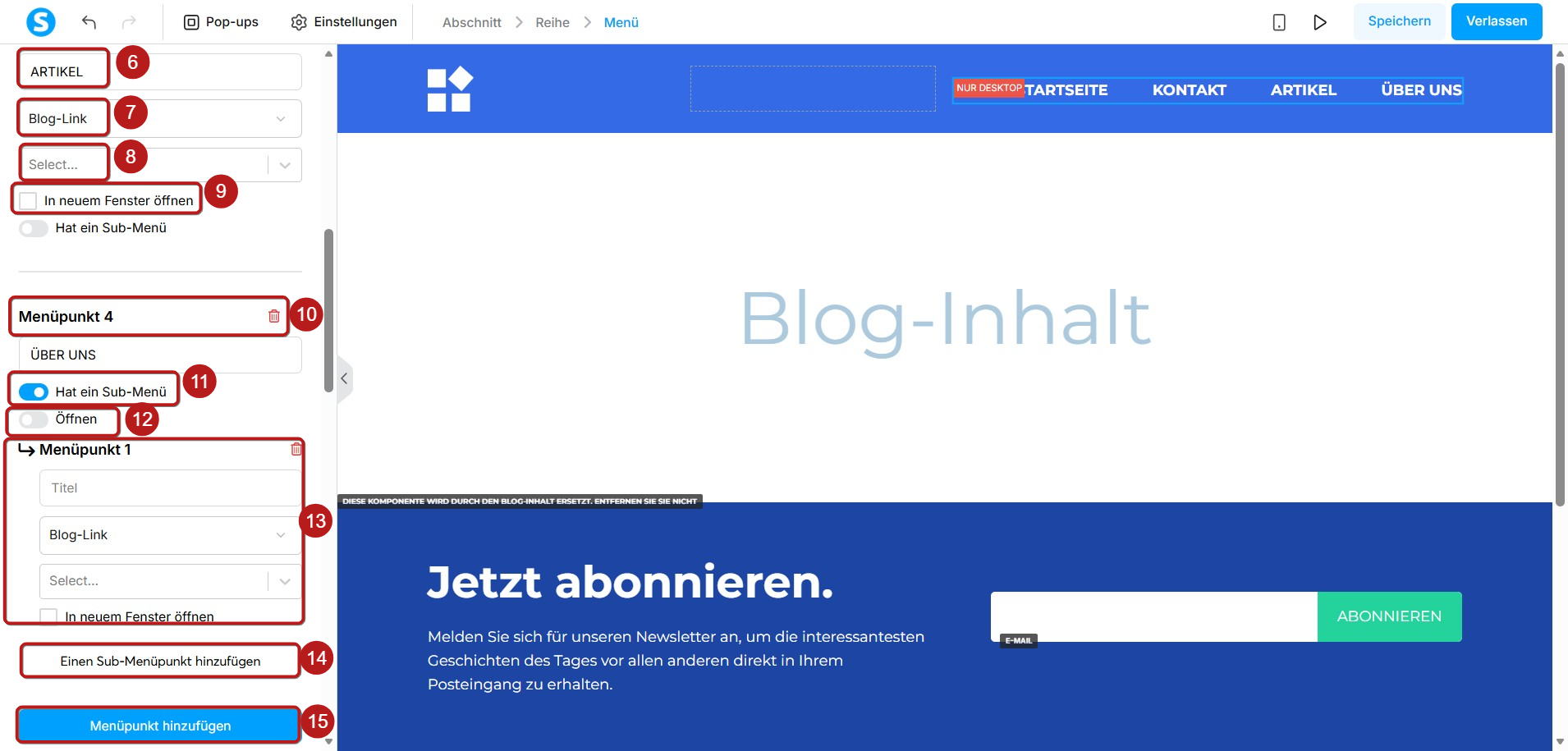 - Öffnen (12): Zeigt die Untermenüeinträge im Editor an, sodass Sie eine Vorschau sehen und sie bearbeiten können.