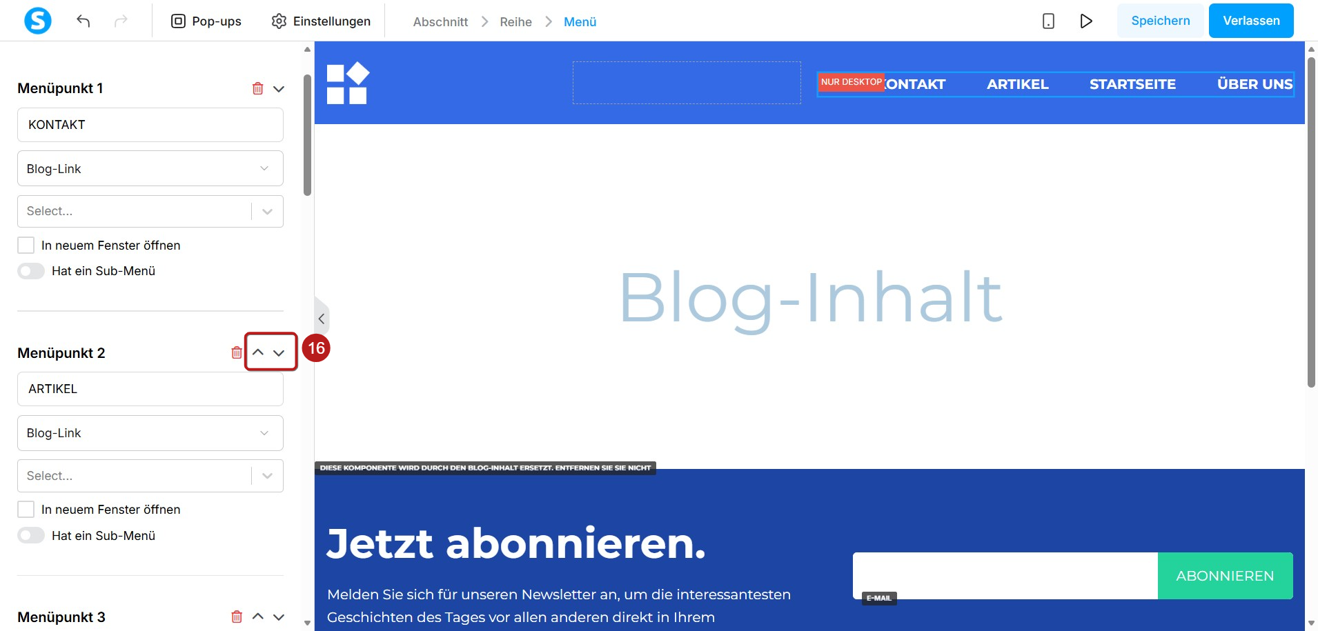 - Menüeintrag verschieben (16): Verwenden Sie die Pfeile, um die Reihenfolge Ihrer Menüeinträge zu ändern.