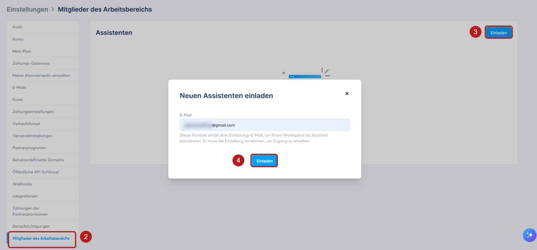 Geben Sie im Popup Neuen Assistenten einladen die E-Mail-Adresse der Person ein, die Sie einladen möchten, und klicken Sie anschließend auf Einladen (4).I
