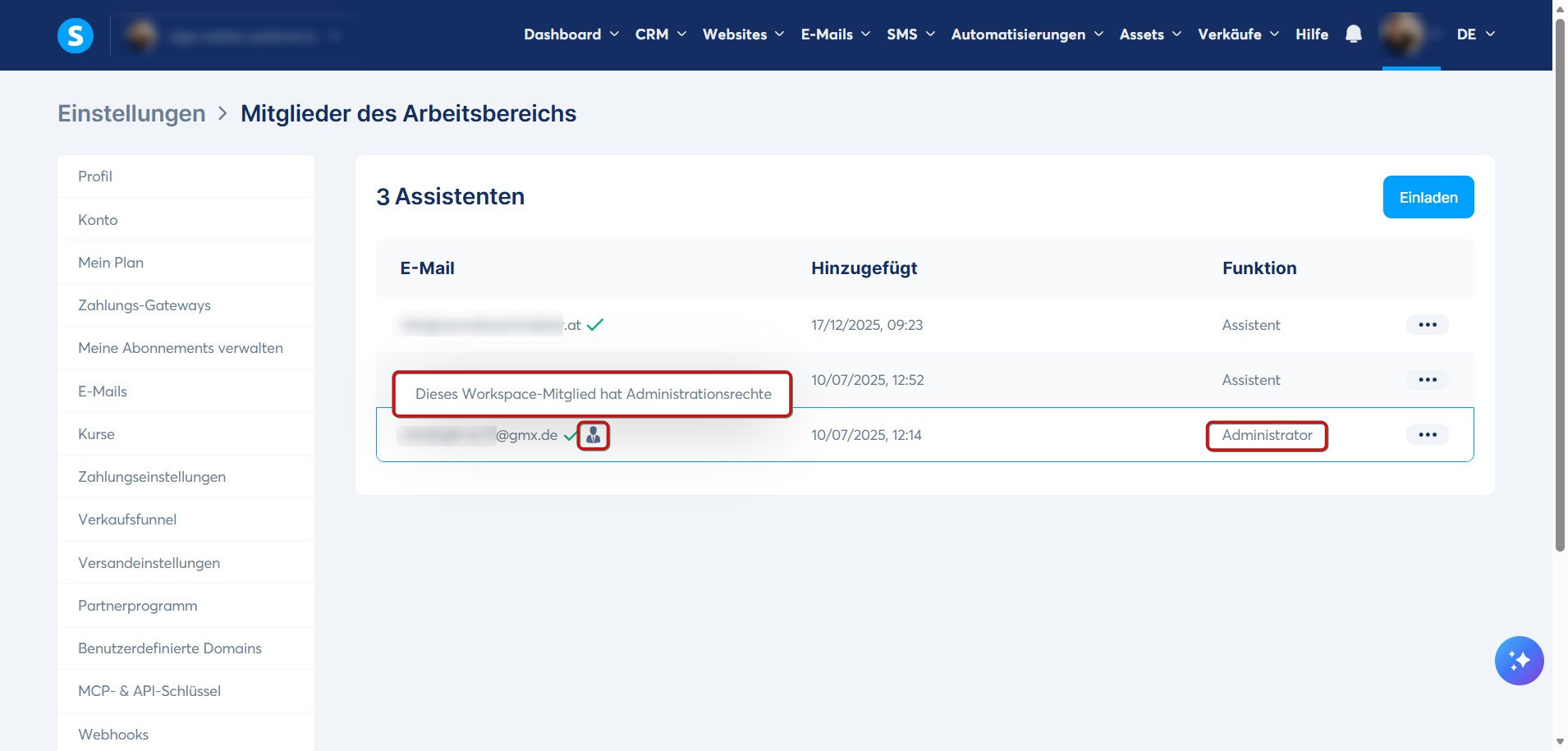 - Arbeitsbereichsmitglieder: Neue Assistenten einladen und deren Zugriff verwalten