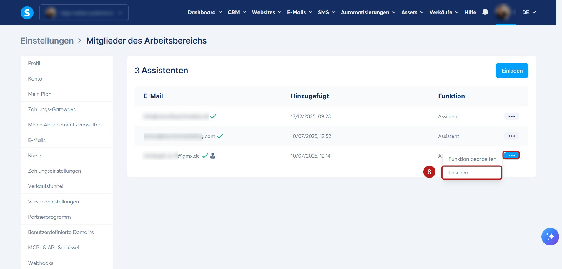 Um den Zugriff eines Assistenten auf Ihren Arbeitsbereich zu widerrufen, klicken Sie auf die drei Punkte neben dem Assistenten und wählen Sie Löschen (8) aus.