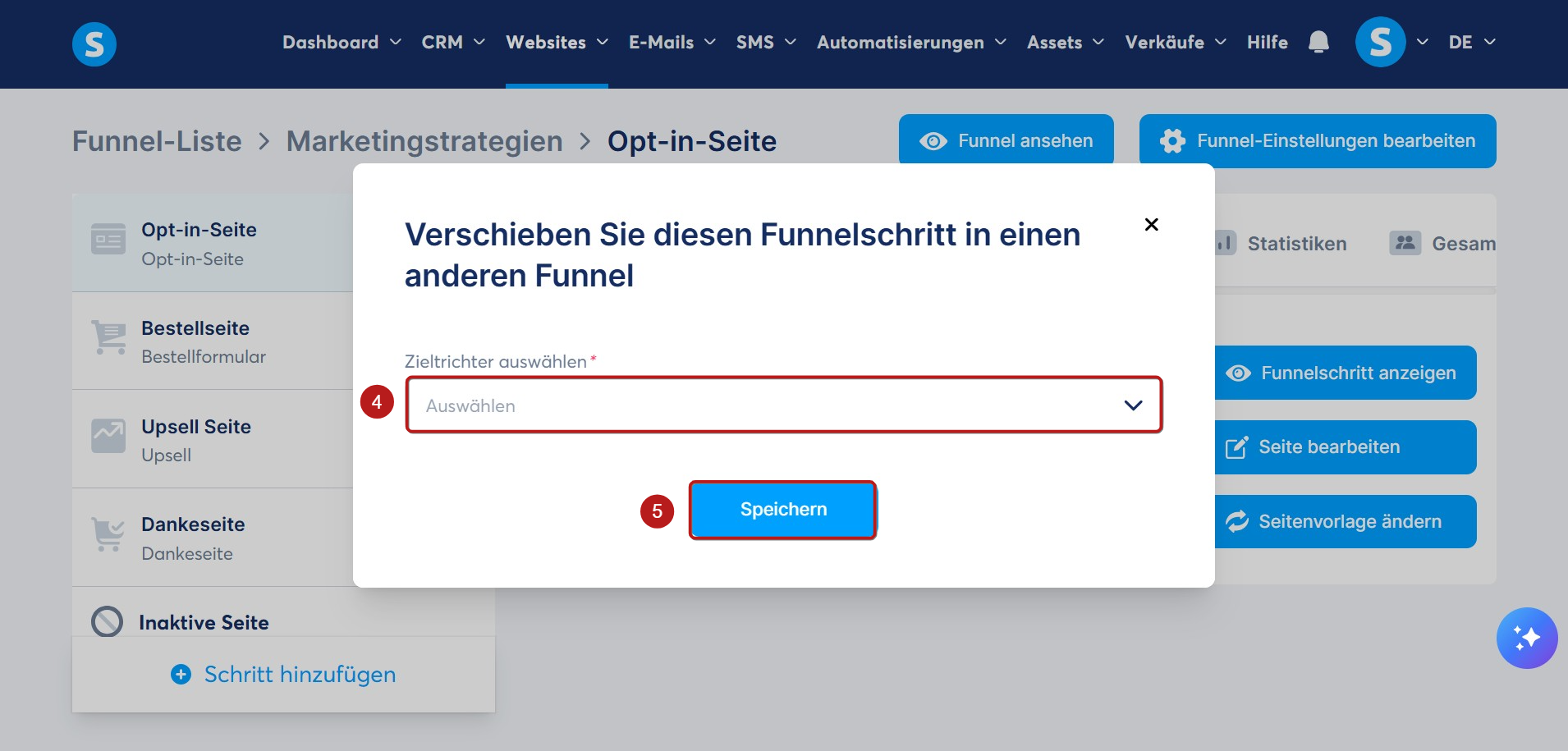 Wählen Sie den Ziel-Funnel (4) aus und klicken Sie dann auf Speichern (5).