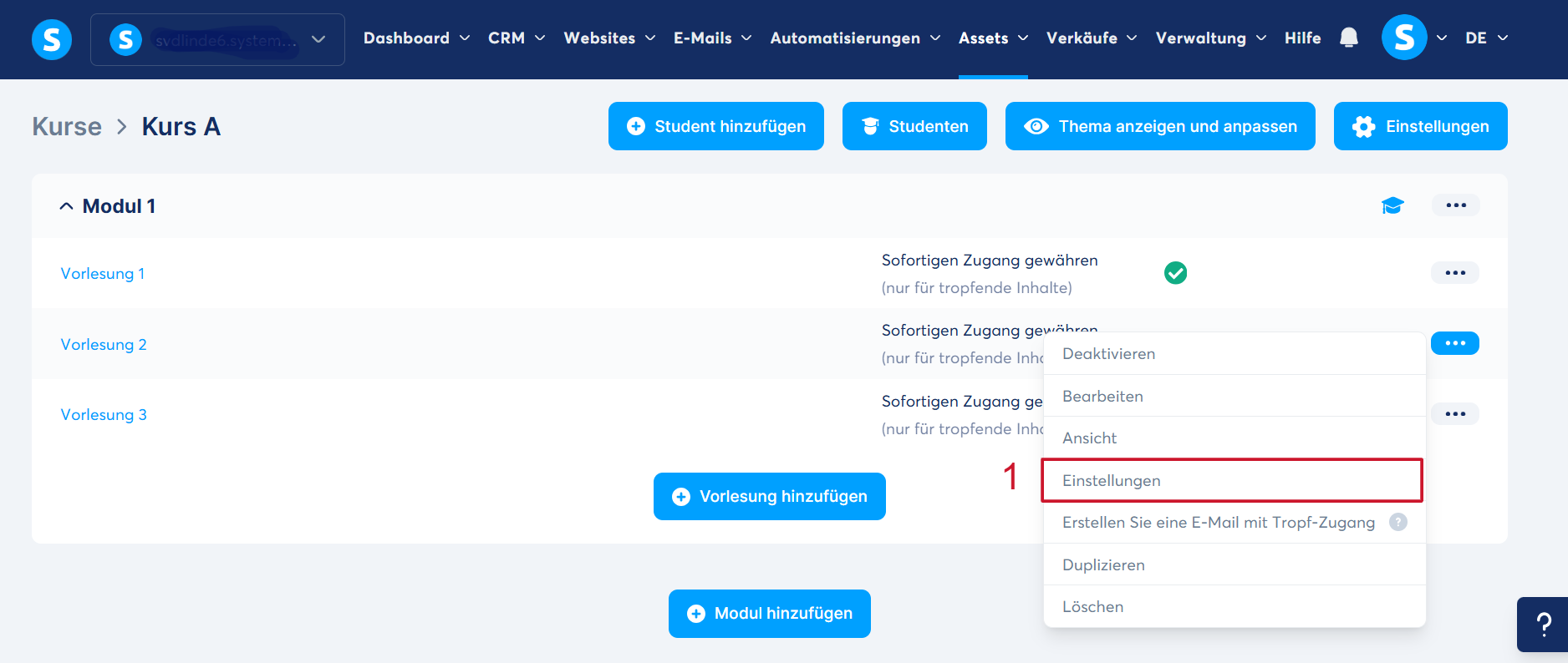 Um einen Kommentarbereich zu einer Vorlesung hinzuzufügen, öffnen Sie den Kurs, um die Liste der Module und Vorlesungen anzuzeigen. In der Vorlesung, in der Sie den Kommentarbereich hinzufügen möchten, klicken Sie auf „Einstellungen“ (1).