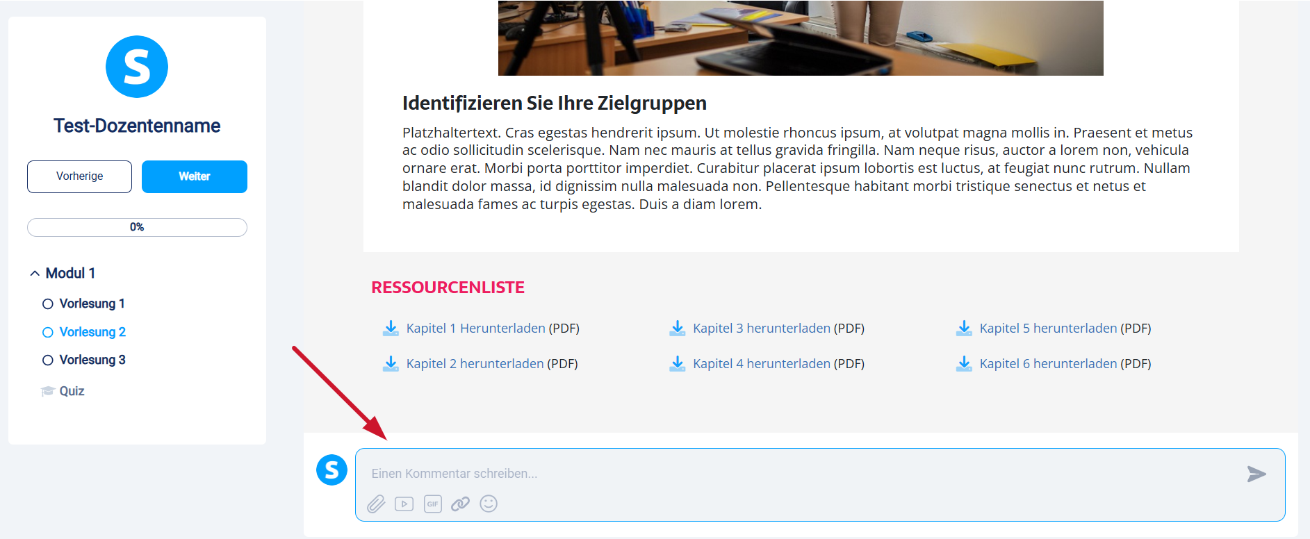 Wenn die Studenten Ihre Vorlesung ansehen, sehen sie den Kommentarbereich am unteren Rand der Vorlesungsseite.