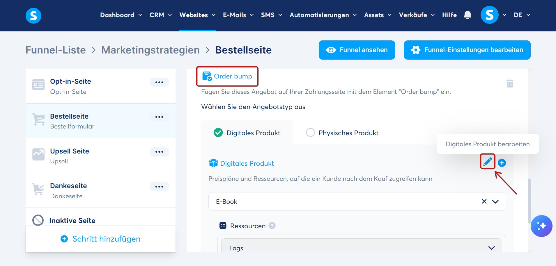 2. Navigieren Sie zu den Einstellungen Ihrer Zahlungsseite. Klicken Sie im Abschnitt Order Bump auf das Stiftsymbol, um das digitale Produkt zu bearbeiten.