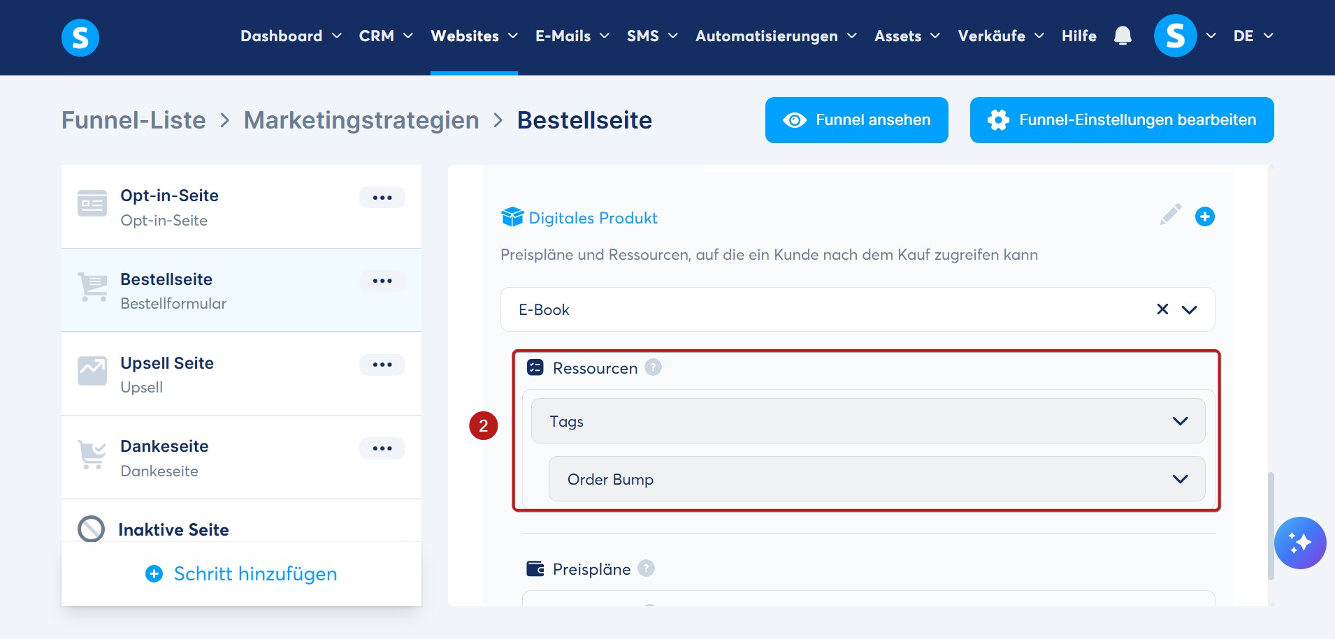 Fügen Sie im Abschnitt Ressourcen das soeben erstellte Order Bump-Tag (2) hinzu.