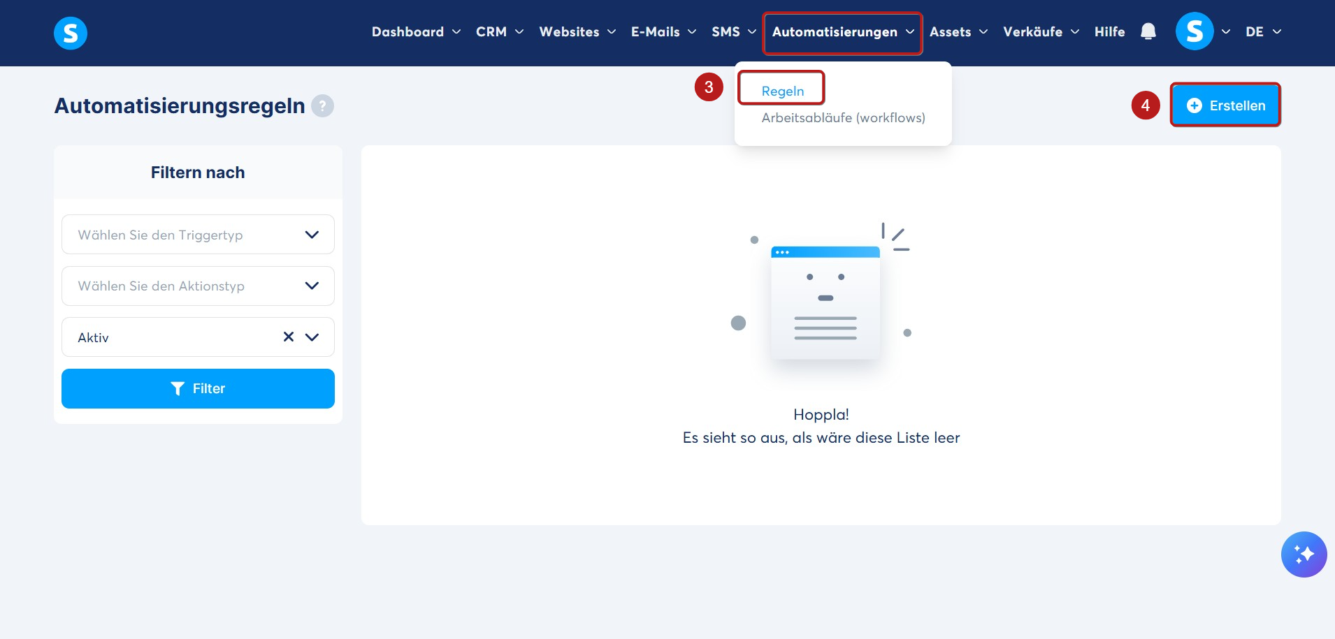 - Navigieren Sie im Hauptmenü zu Automatisierungen > Regeln (3). Klicken Sie auf Erstellen (4).