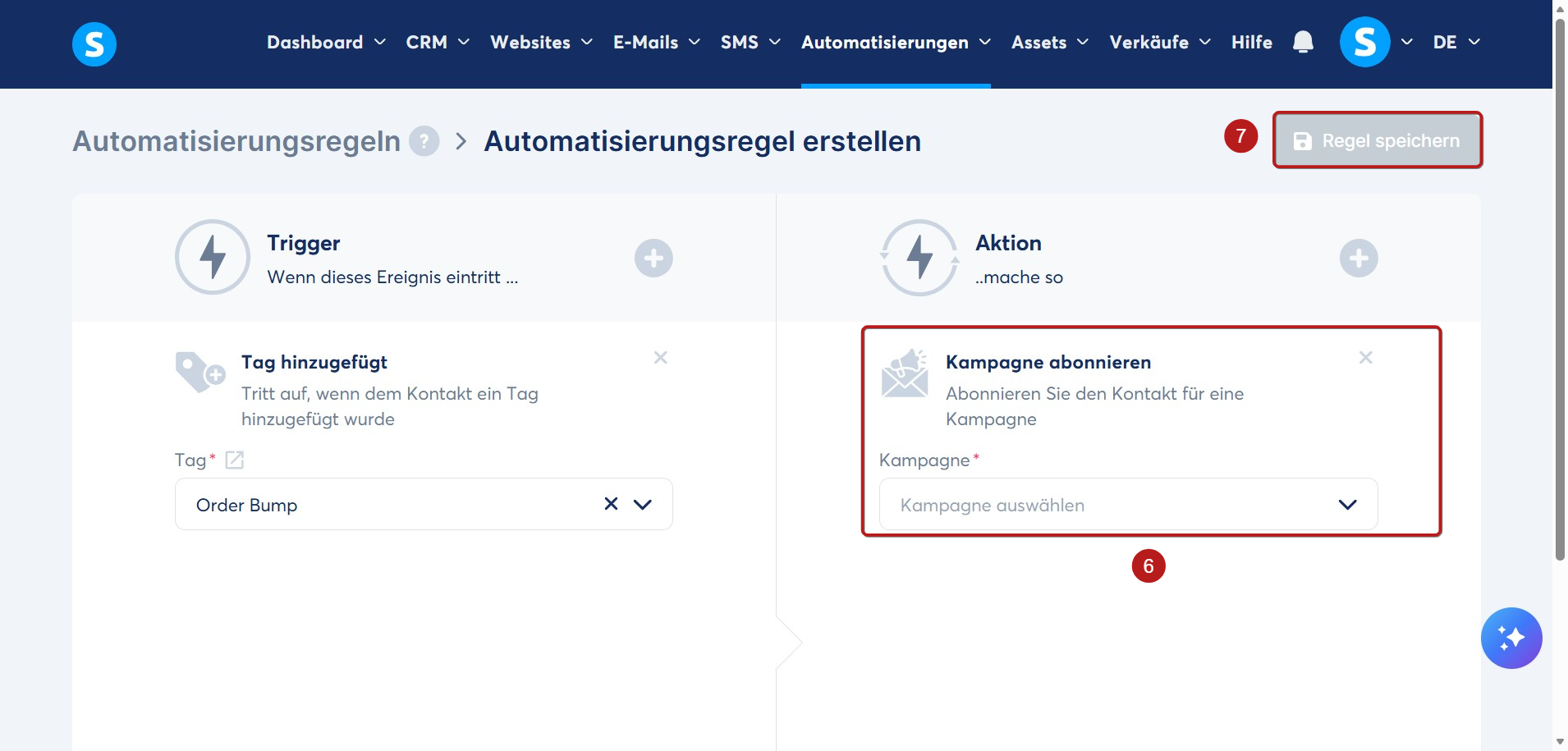 Beispiel: Kampagne abonnieren, wenn das Order Bump-Tag hinzugefügt wird (6).