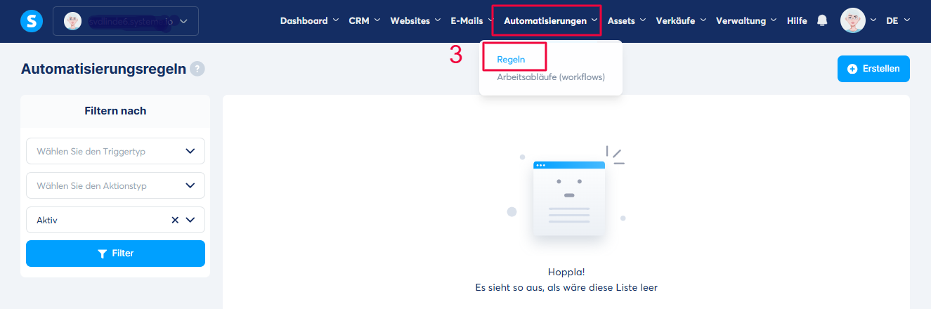 3. Erstellen Sie eine Automatisierungsregel, indem Sie im Menü auf den Bereich Automatisierungen und dann auf "Regeln" gehen (Nummer 3 in der Abbildung).