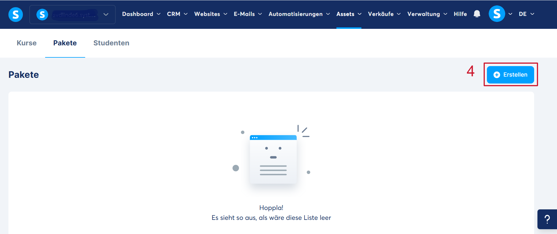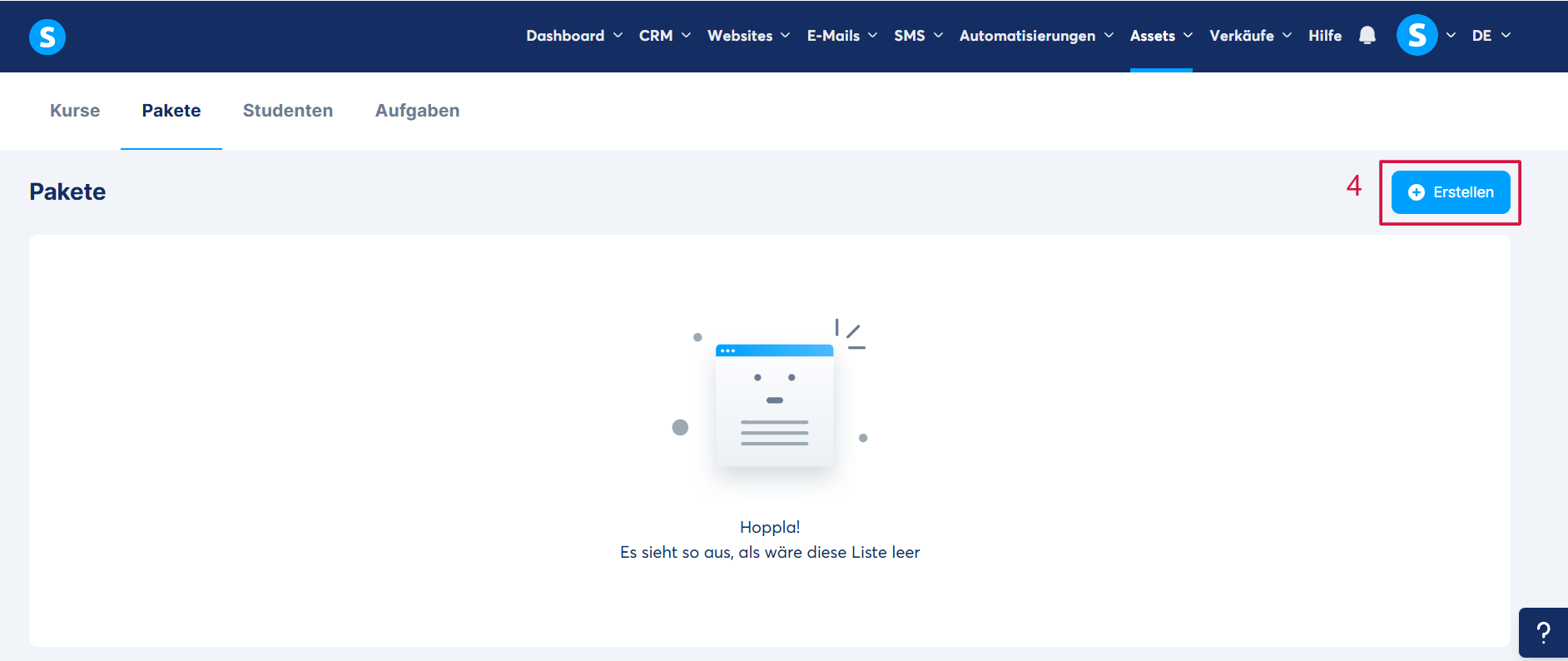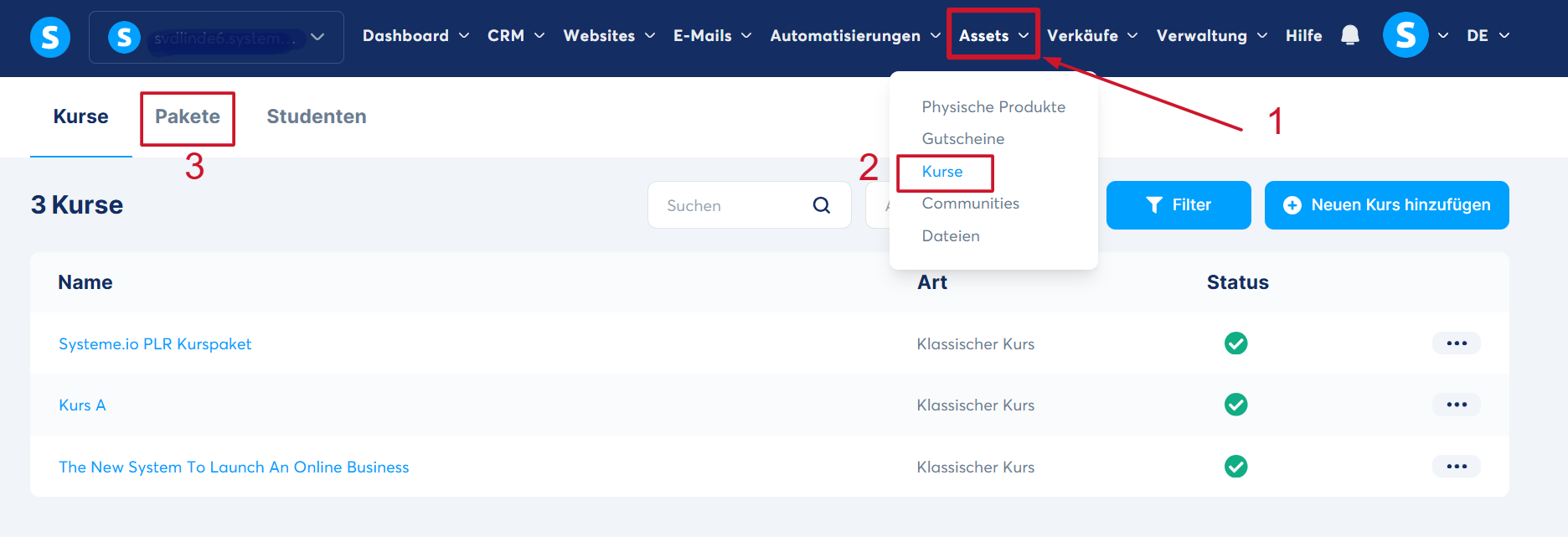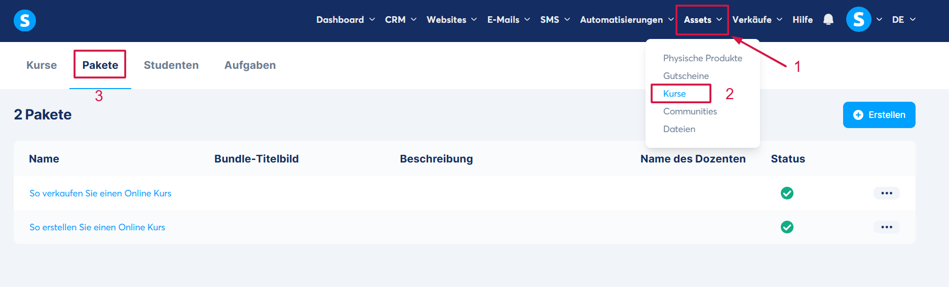Gehen Sie im Menü auf „Assets“ (1), dann auf „Kurse“ (2) und schließlich auf „Pakete“ (3).
