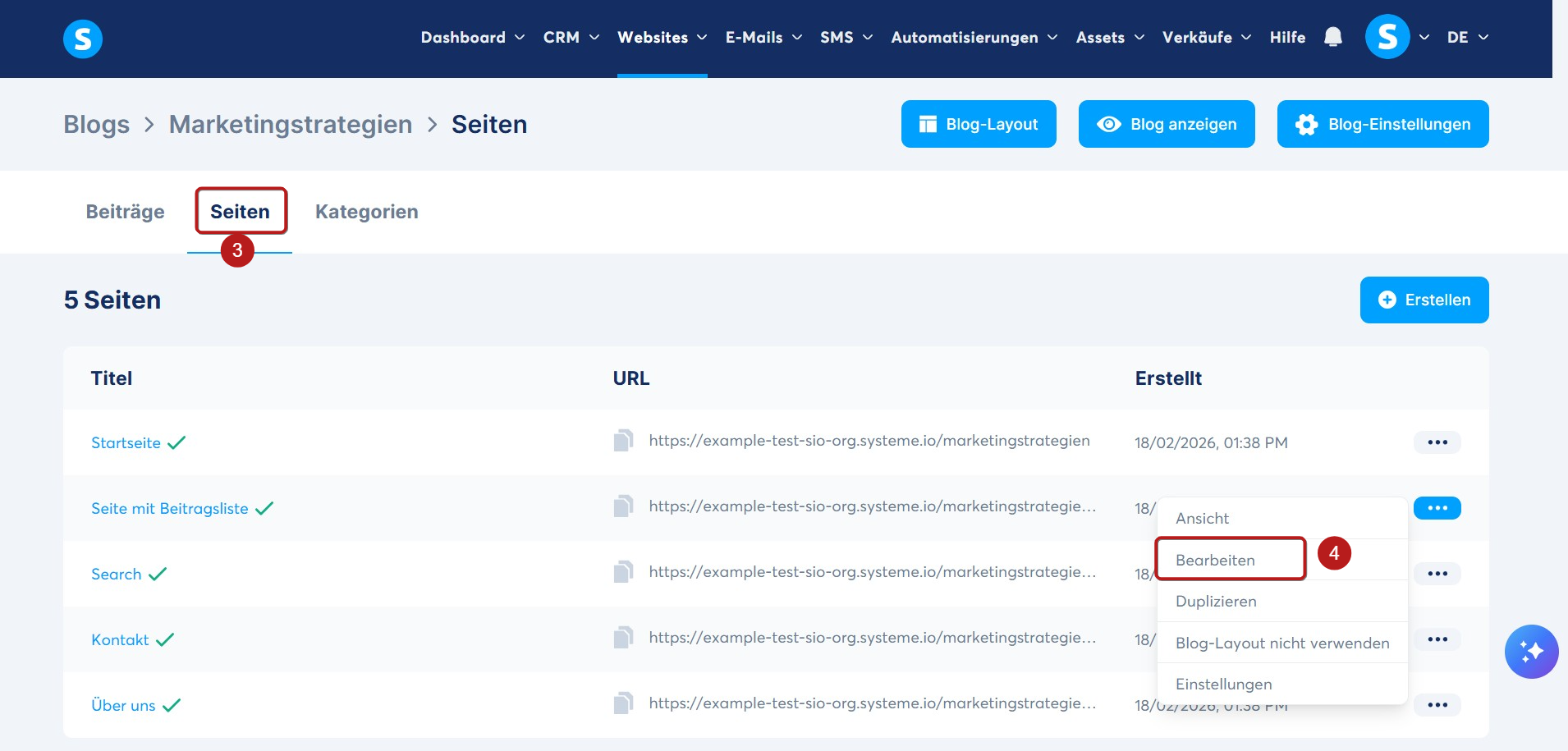 Wechseln Sie im Blog-Dashboard zum Bereich Seiten (3). Klicken Sie anschließend auf das Bearbeiten-Symbol neben der Beitragsübersichtsseite (4).