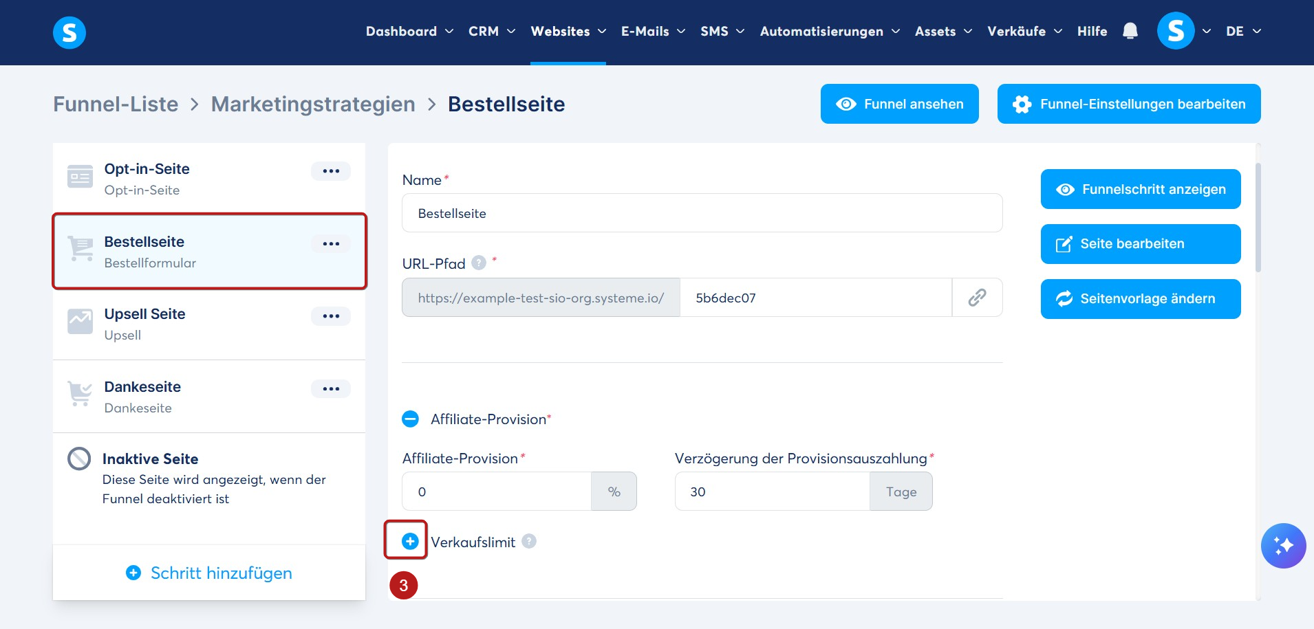 Gehen Sie zum Tab Websites, klicken Sie auf Verkaufsfunnels (1) und anschließend auf den Funnel, bei dem Sie das Verkaufslimit hinzufügen möchten (2).