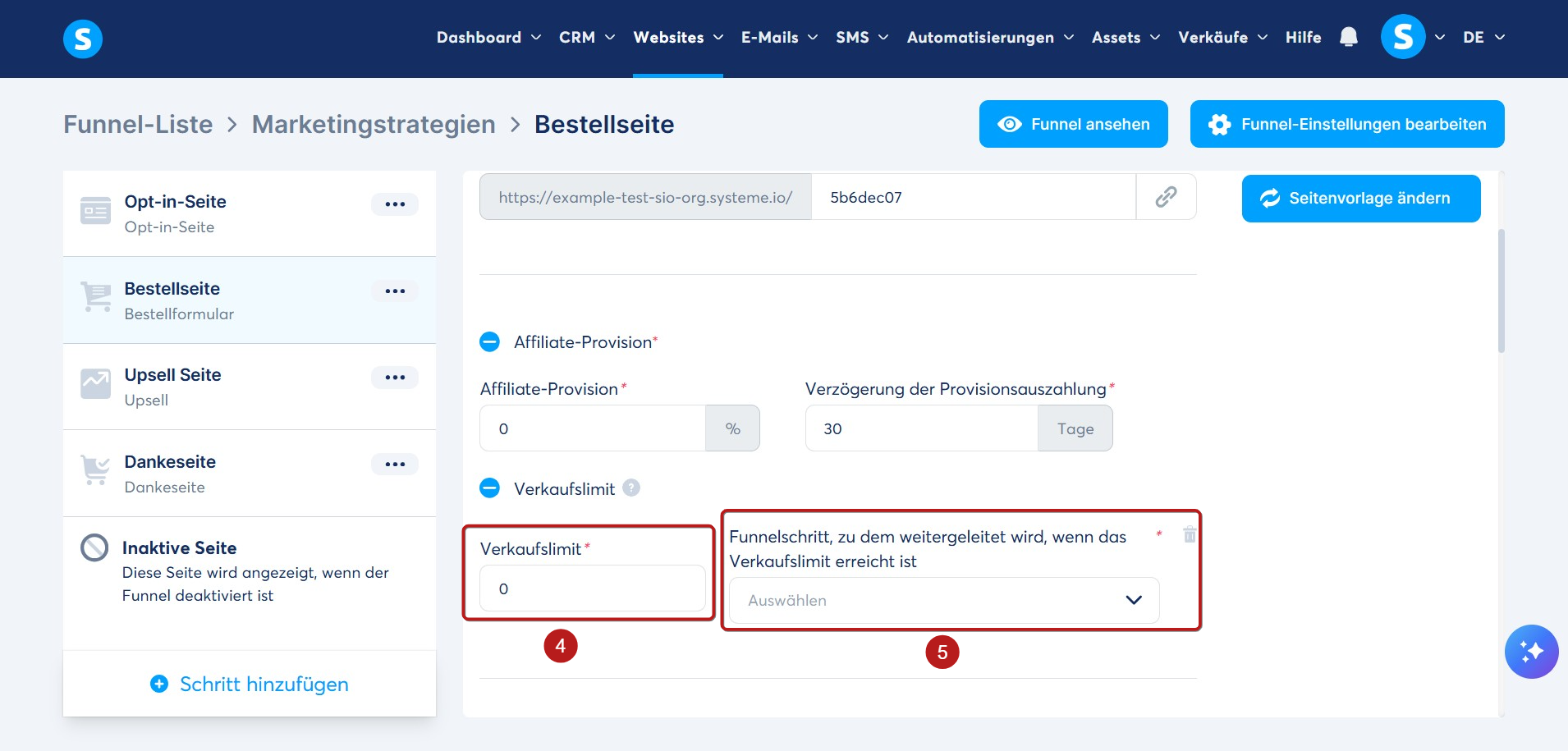 Sobald das Verkaufslimit erreicht ist, werden Besucher zu dem Funnel-Schritt weitergeleitet, den Sie als Zielseite für das Erreichen des Limits festgelegt haben (5).