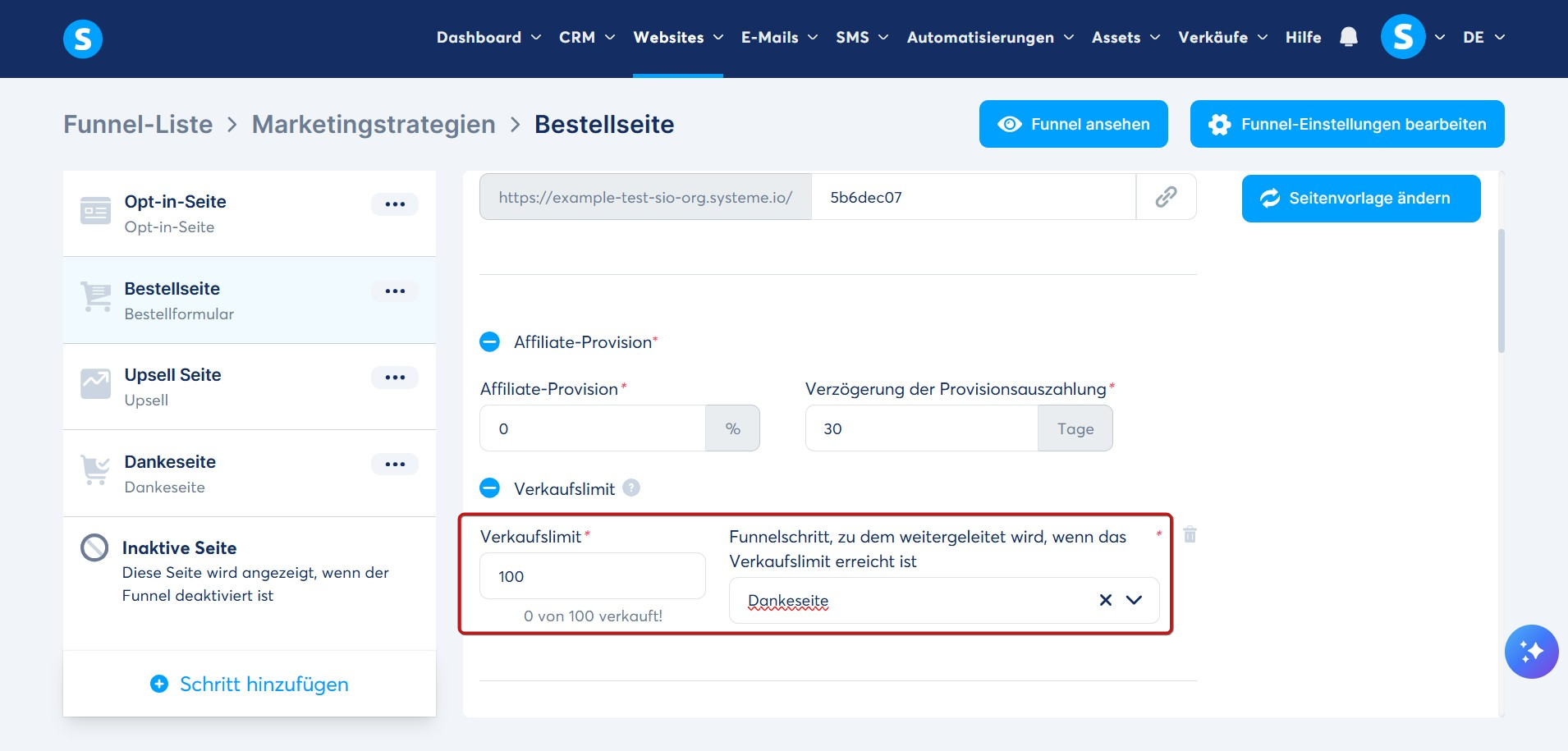 Beispiel: Wenn Sie den Verkauf Ihres Produkts auf 100 Einheiten begrenzen möchten, geben Sie zunächst 100 in das Feld Verkaufslimit ein und wählen dann eine Seite aus, auf der erklärt wird, dass das Verkaufslimit für das Angebot erreicht wurde.