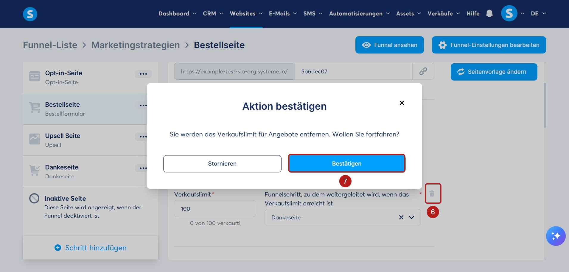 Um das Verkaufslimit von Ihrem Angebot zu entfernen, klicken Sie auf das Mülleimer-Symbol (6). Es erscheint ein Popup; klicken Sie auf Bestätigen (7).
