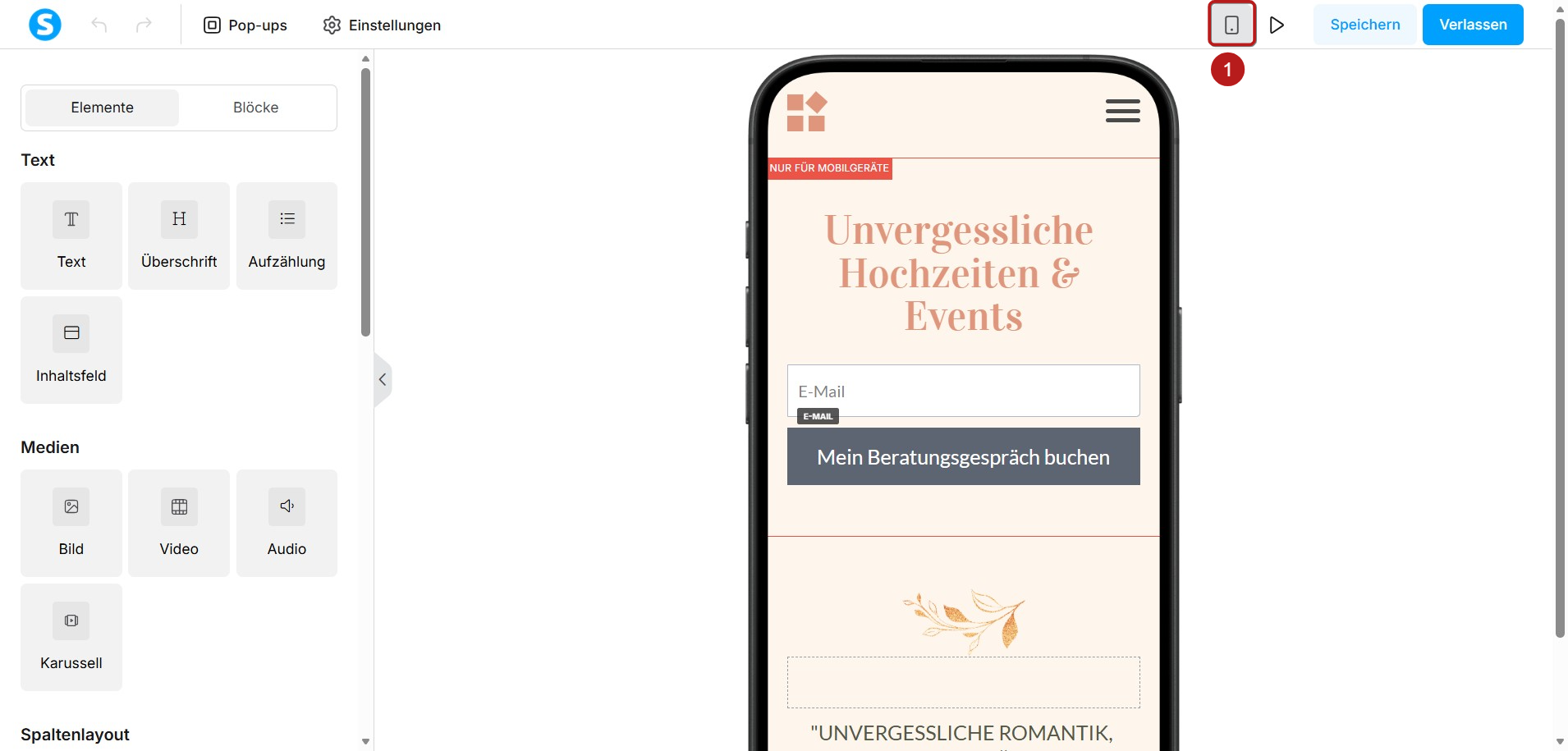 Klicken Sie dazu auf das Mobile-Symbol (1) am unteren Rand des Editors, um zur mobilen Ansicht zu wechseln.