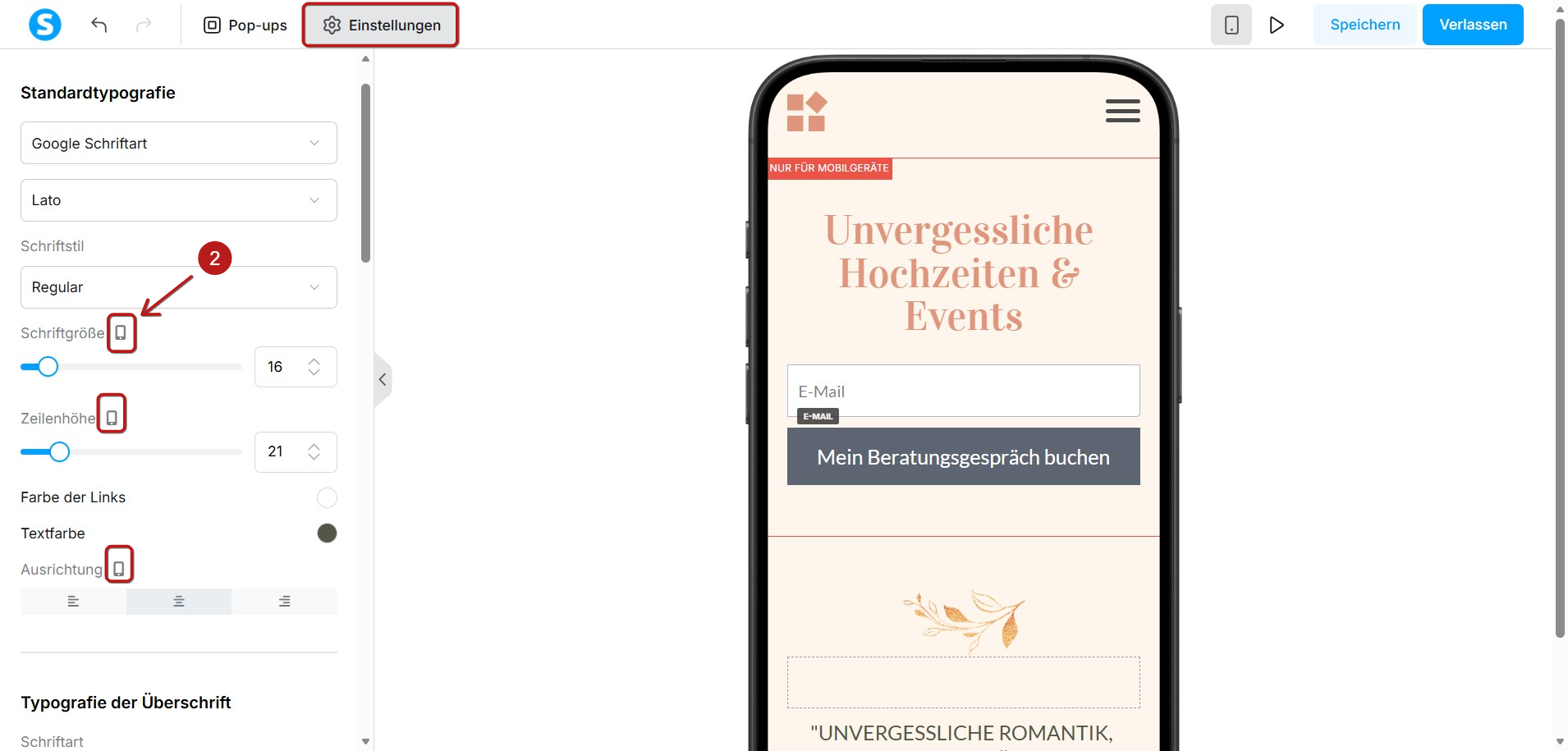 Alle Einstellungen, die mit einem Mobil-Symbol (2) gekennzeichnet sind, gelten nur für die mobile Ansicht. Änderungen hier wirken sich nicht auf die Desktop-Version aus.