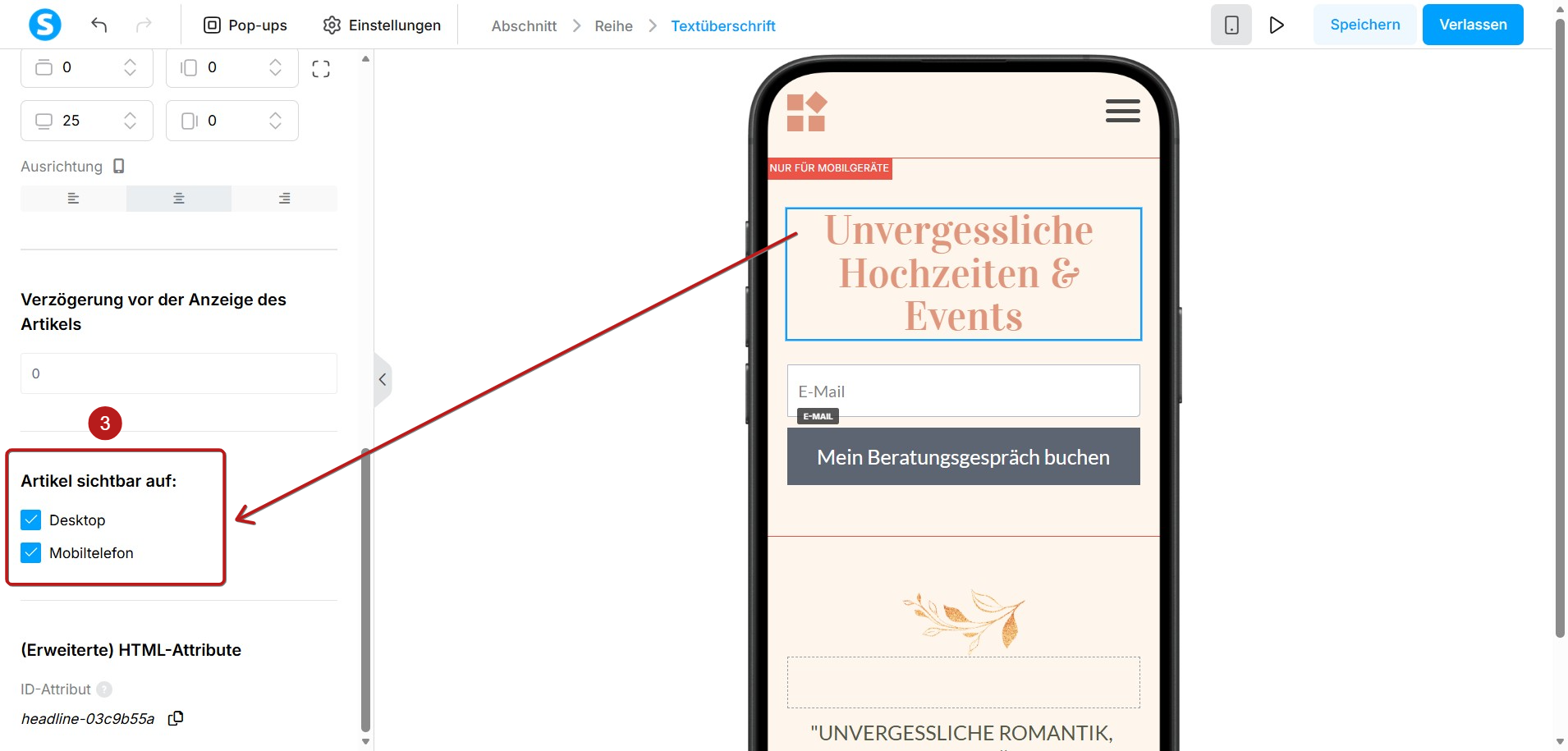 Sie können auswählen, ob Elemente auf bestimmten Geräten angezeigt oder ausgeblendet werden. Verwenden Sie die Kontrollkästchen unter Element sichtbar auf (3), um Desktop oder Mobil auszuwählen.