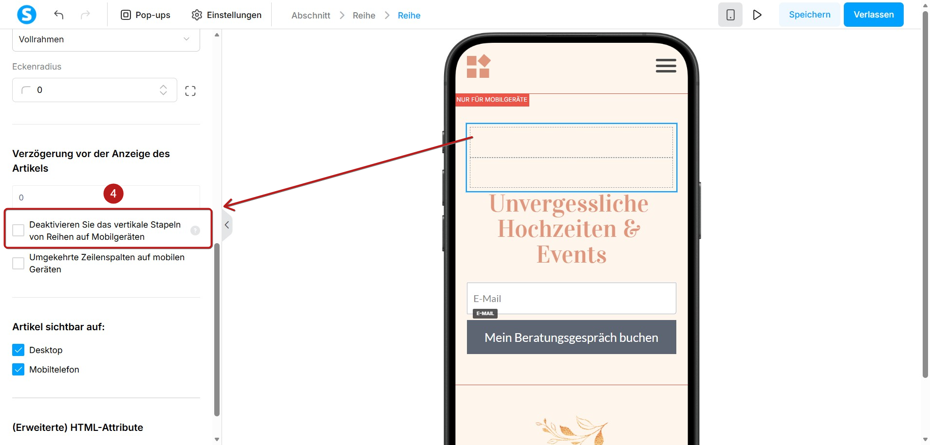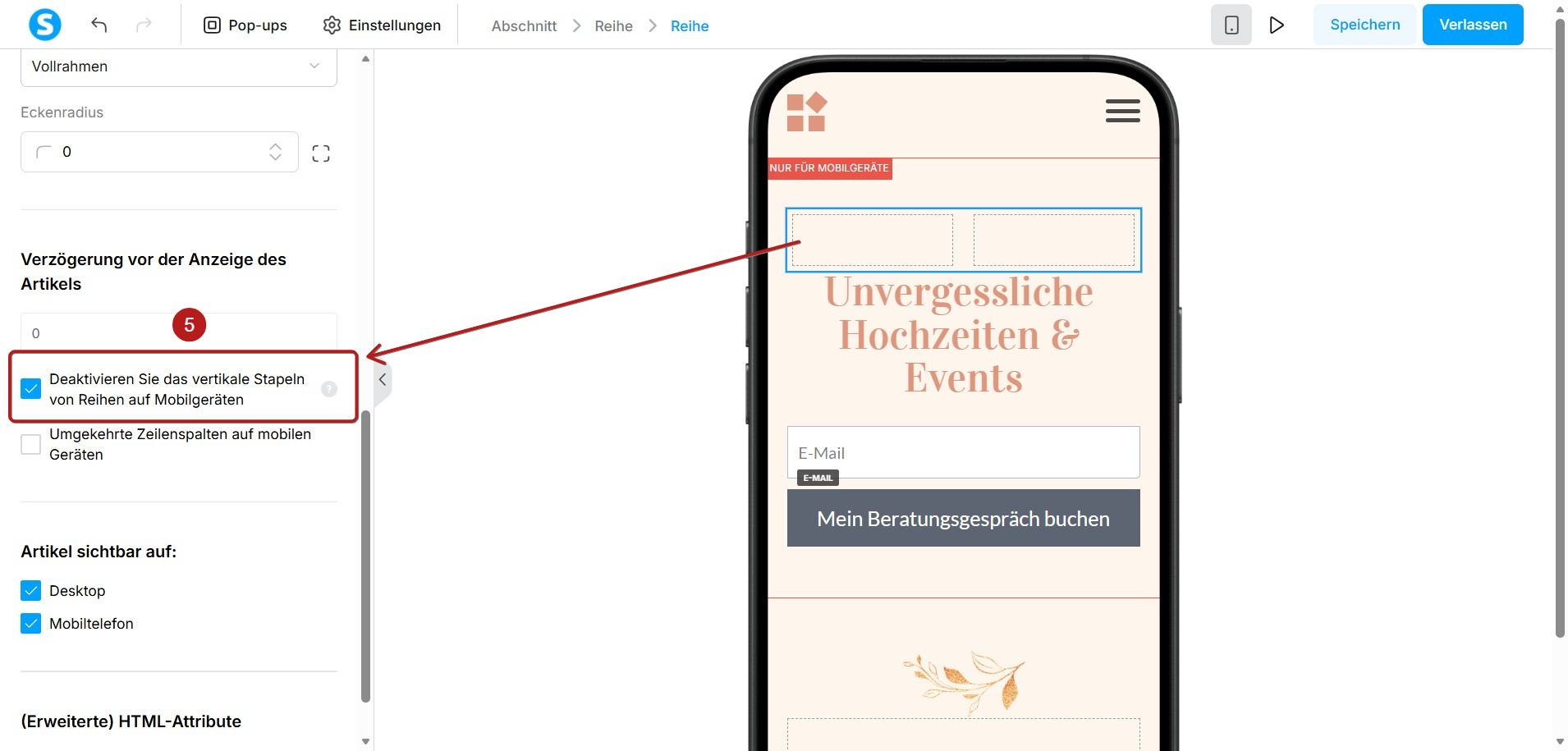 Sie können festlegen, ob Spalten einer Reihe horizontal oder vertikal angezeigt werden, indem Sie das Kontrollkästchen Vertikales Stapeln von Reihen auf Mobilgeräten deaktivieren aktivieren oder deaktivieren.