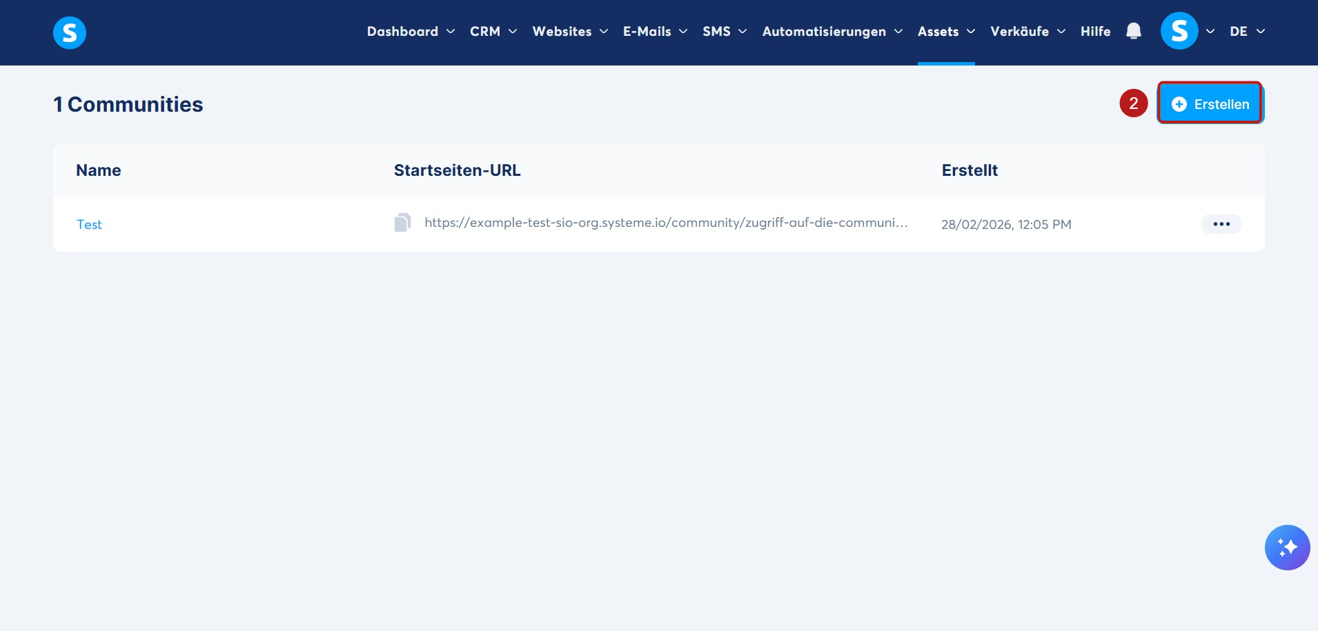 Auf der Seite Communities klicken Sie auf die Schaltfläche Erstellen (2).