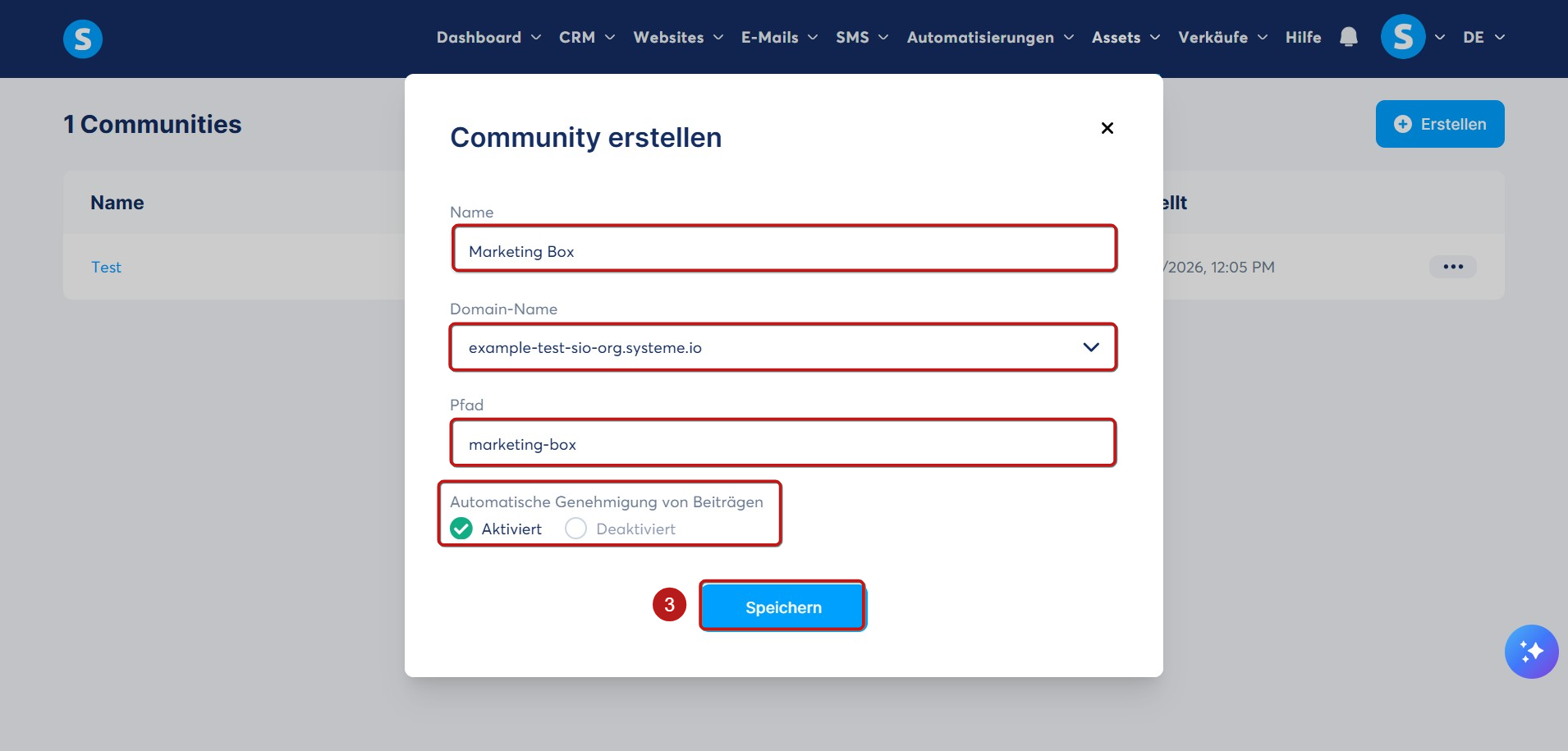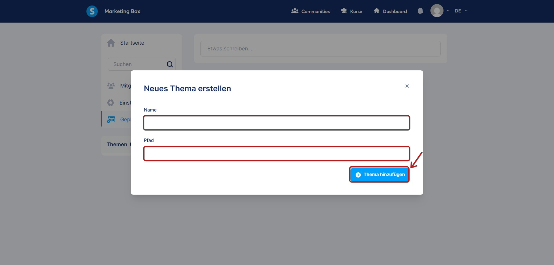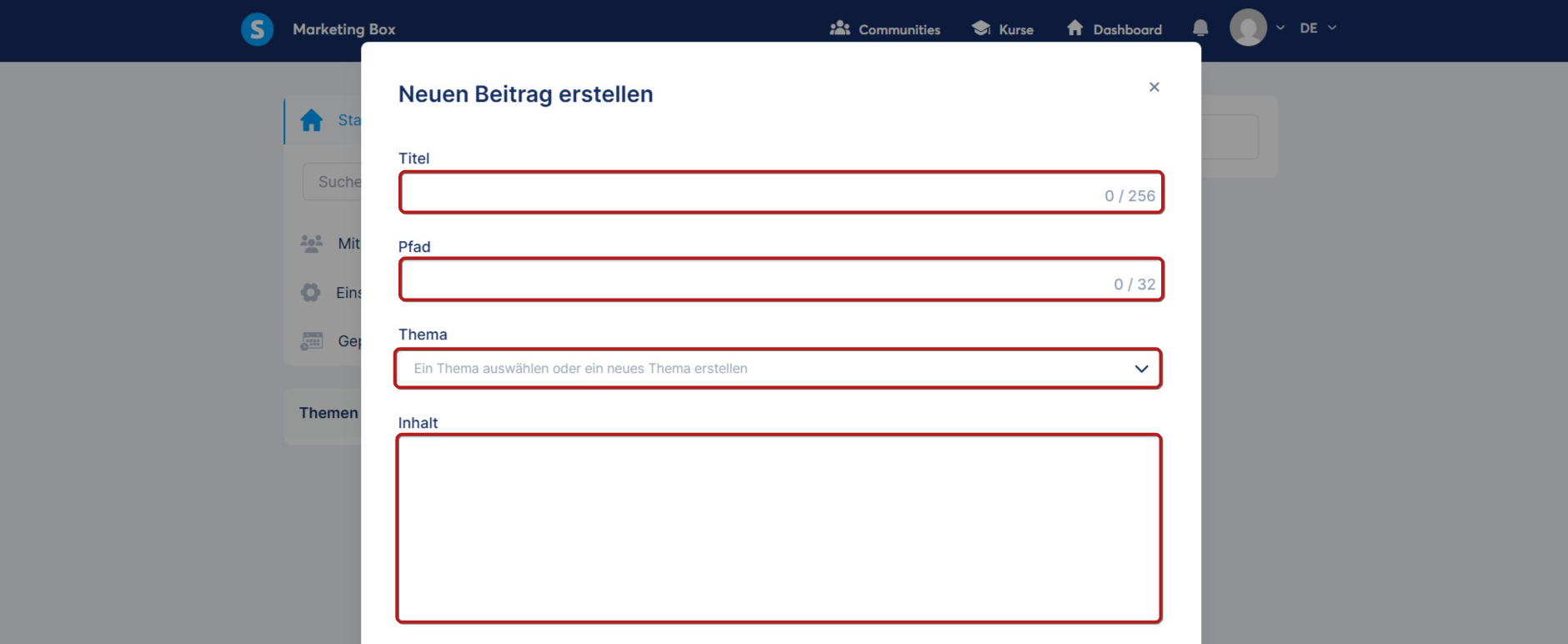 Im erscheinenden Popup geben Sie die folgenden Informationen für Ihre Community ein: