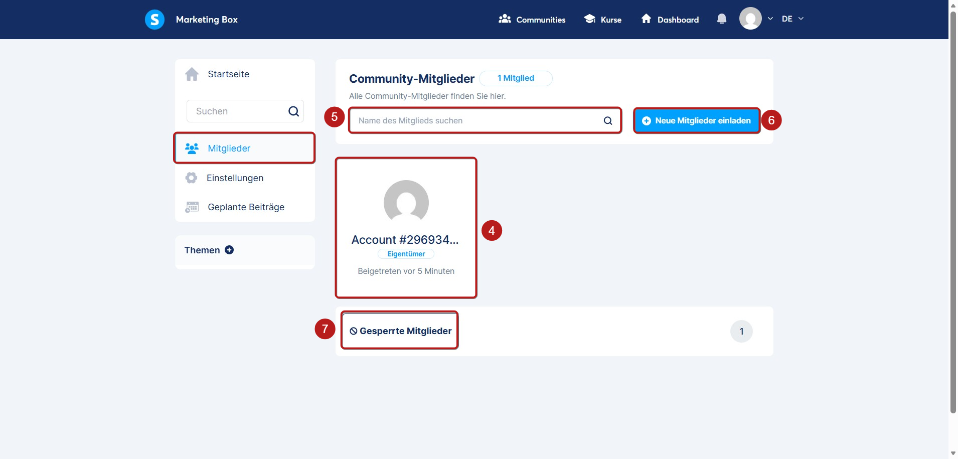 Sie können nach dem Namen eines Mitglieds suchen (5) und Mitglieder einladen, Ihrer Community beizutreten, indem Sie auf Neue Mitglieder einladen (6) klicken.