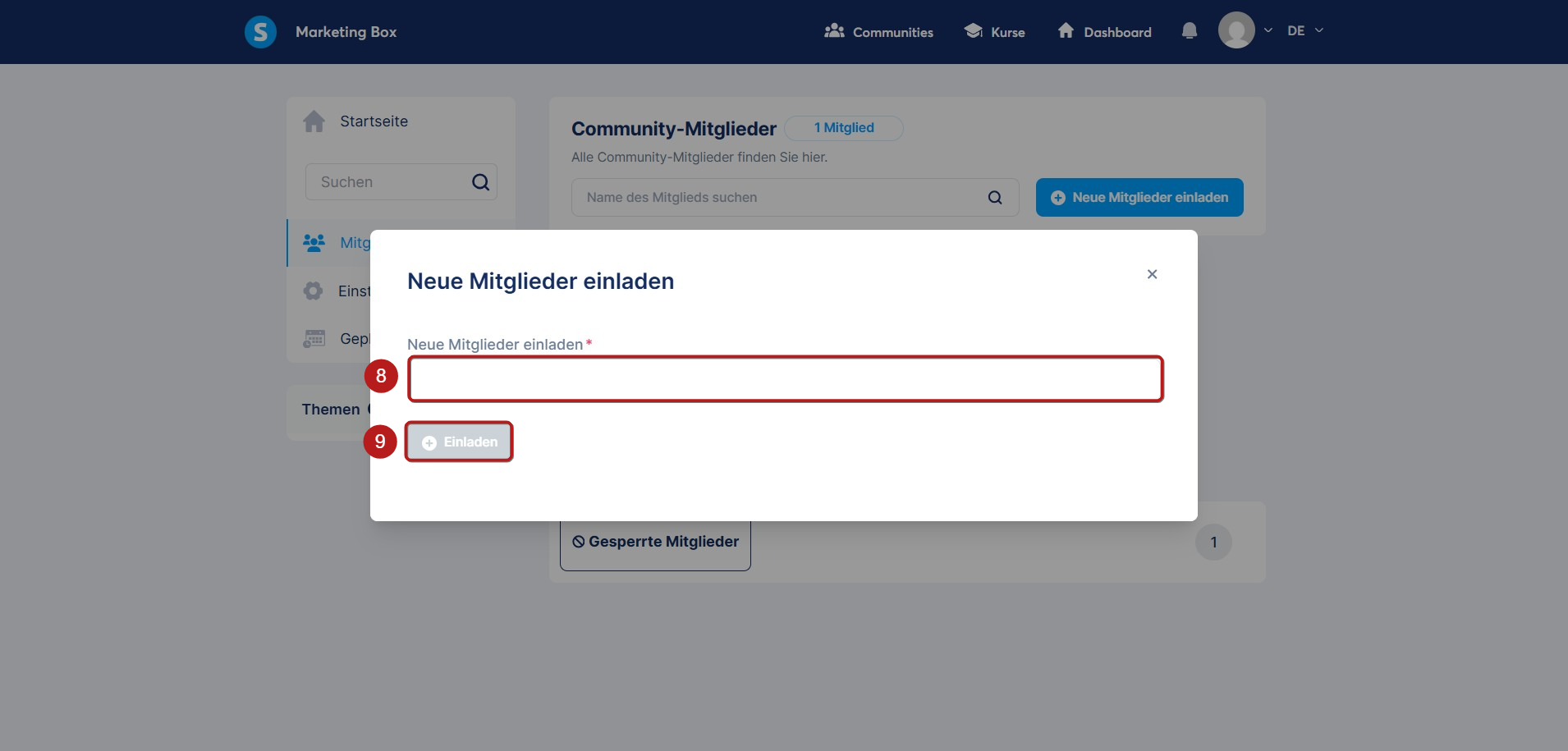 Sie können ein Mitglied einladen, indem Sie dessen E-Mail-Adresse eingeben (8) und dann auf Einladen (9) klicken.