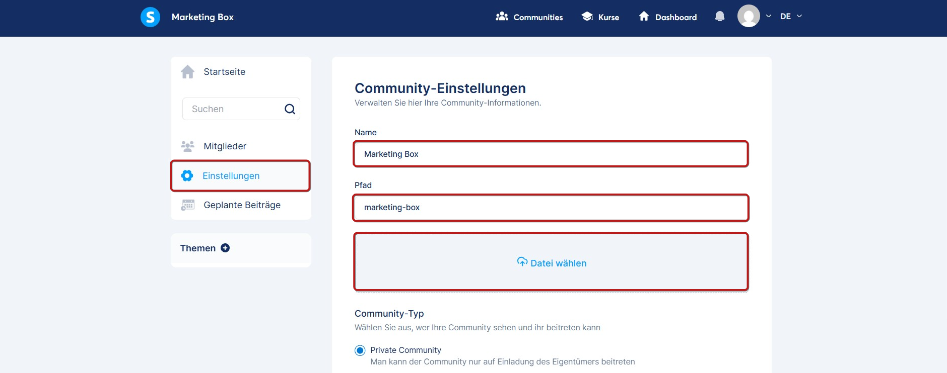 Im Reiter Einstellungen können Sie den Namen der Community, den URL-Pfad ändern und ein Titelbild für Ihre Community hinzufügen.