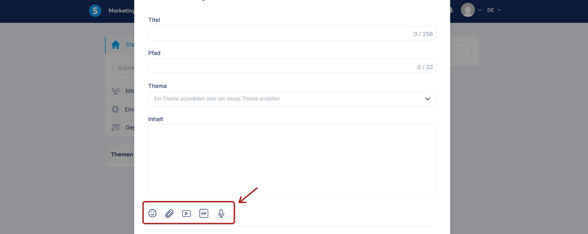 Es erscheint ein Popup, in dem Sie einen Titel und einen Pfad für Ihren Beitrag eingeben, ein Thema auswählen und Ihren Inhalt schreiben können.