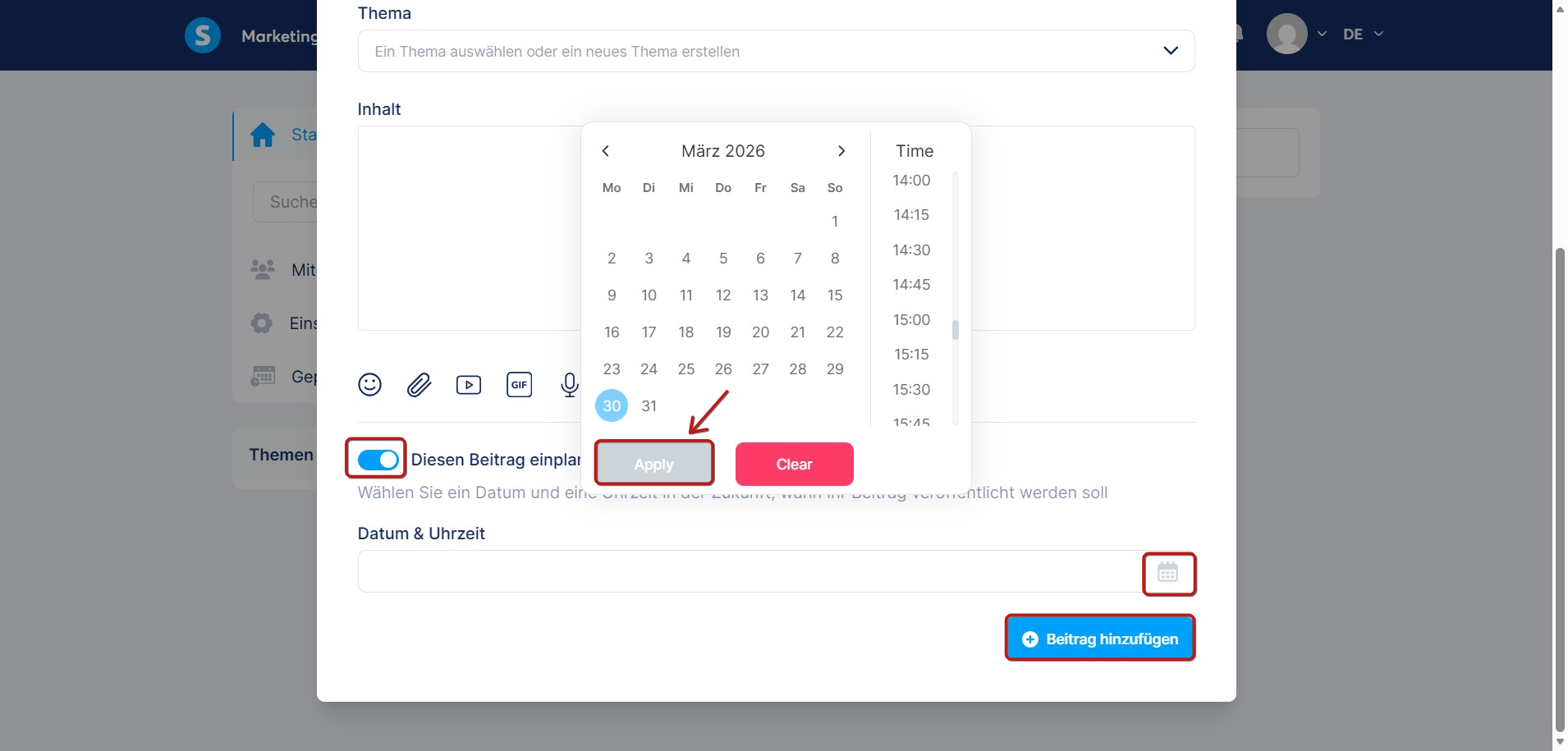 Nachdem Sie Ihren Beitrag erstellt haben, können Sie sofort veröffentlichen, indem Sie auf Beitrag hinzufügen klicken, oder ihn planen, indem Sie den Schalter Diesen Beitrag einplanen aktivieren.