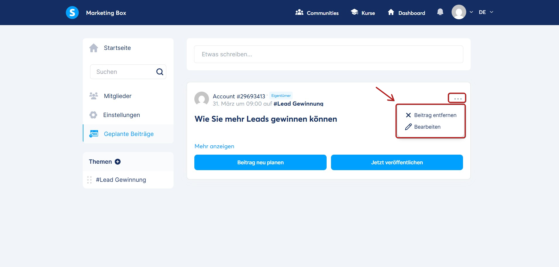 Nachdem der Beitrag veröffentlicht wurde, können Sie auf das Drei-Punkte-Menü klicken und dann Beitrag entfernen, um den Beitrag zu löschen, oder Bearbeiten, um Änderungen am Beitrag vorzunehmen.