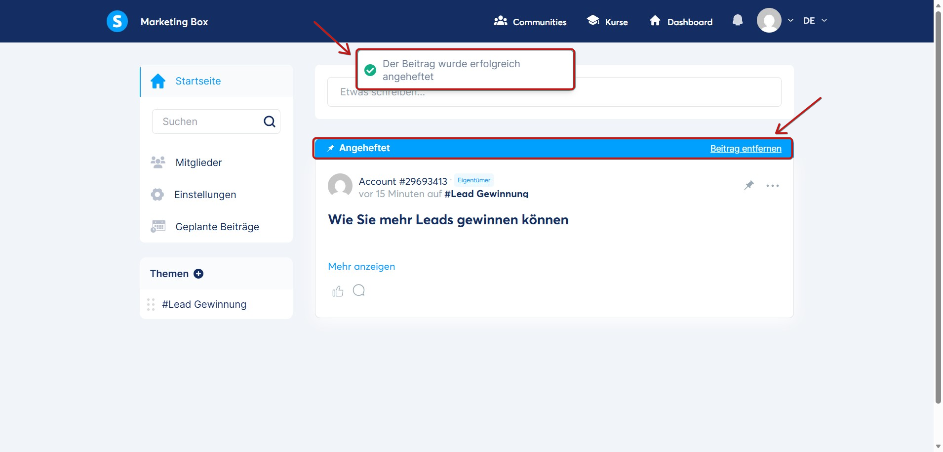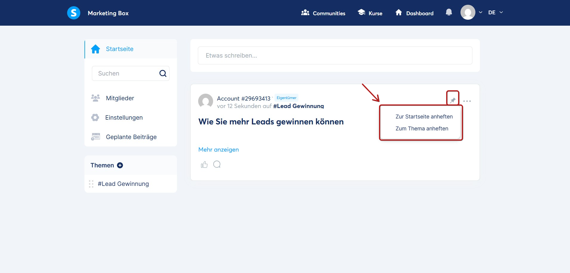 Community-Besitzer und Moderatoren können Beiträge anpinnen, indem sie auf das Pin-Symbol (10) klicken und auswählen, ob der Beitrag auf der Startseite oder im entsprechenden Thema angezeigt werden soll.
