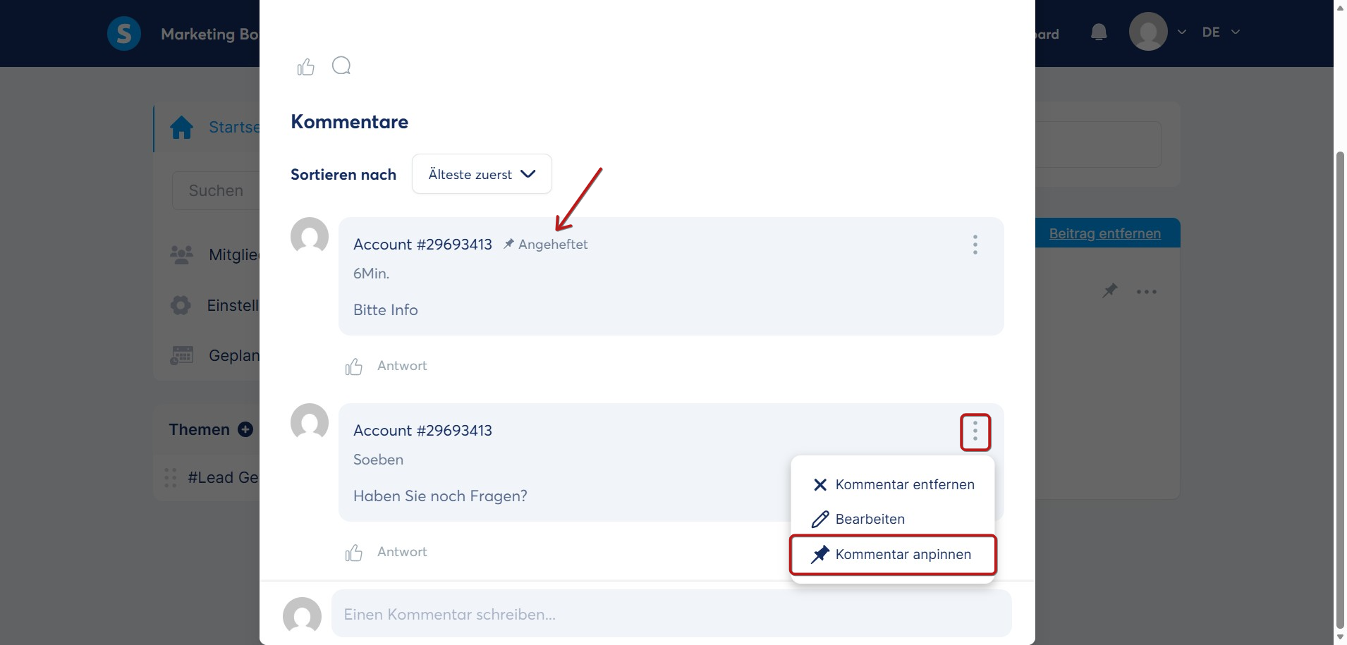 Angepinnte Kommentare werden oben angezeigt und sind mit dem Hinweis Pinned gekennzeichnet.